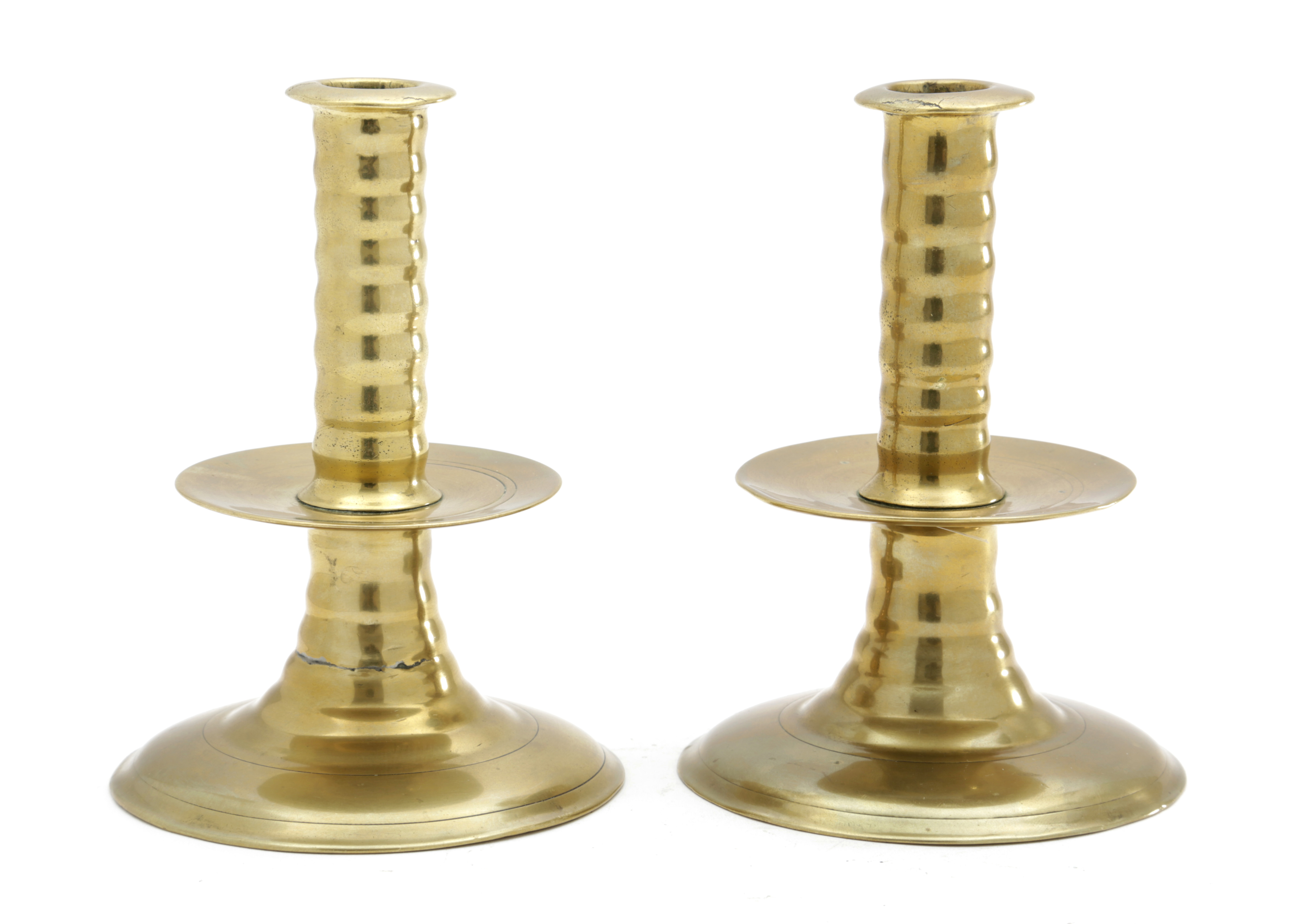 A RARE PAIR OF SMALL BRASS TRUMPET-BASE CANDLESTICKS