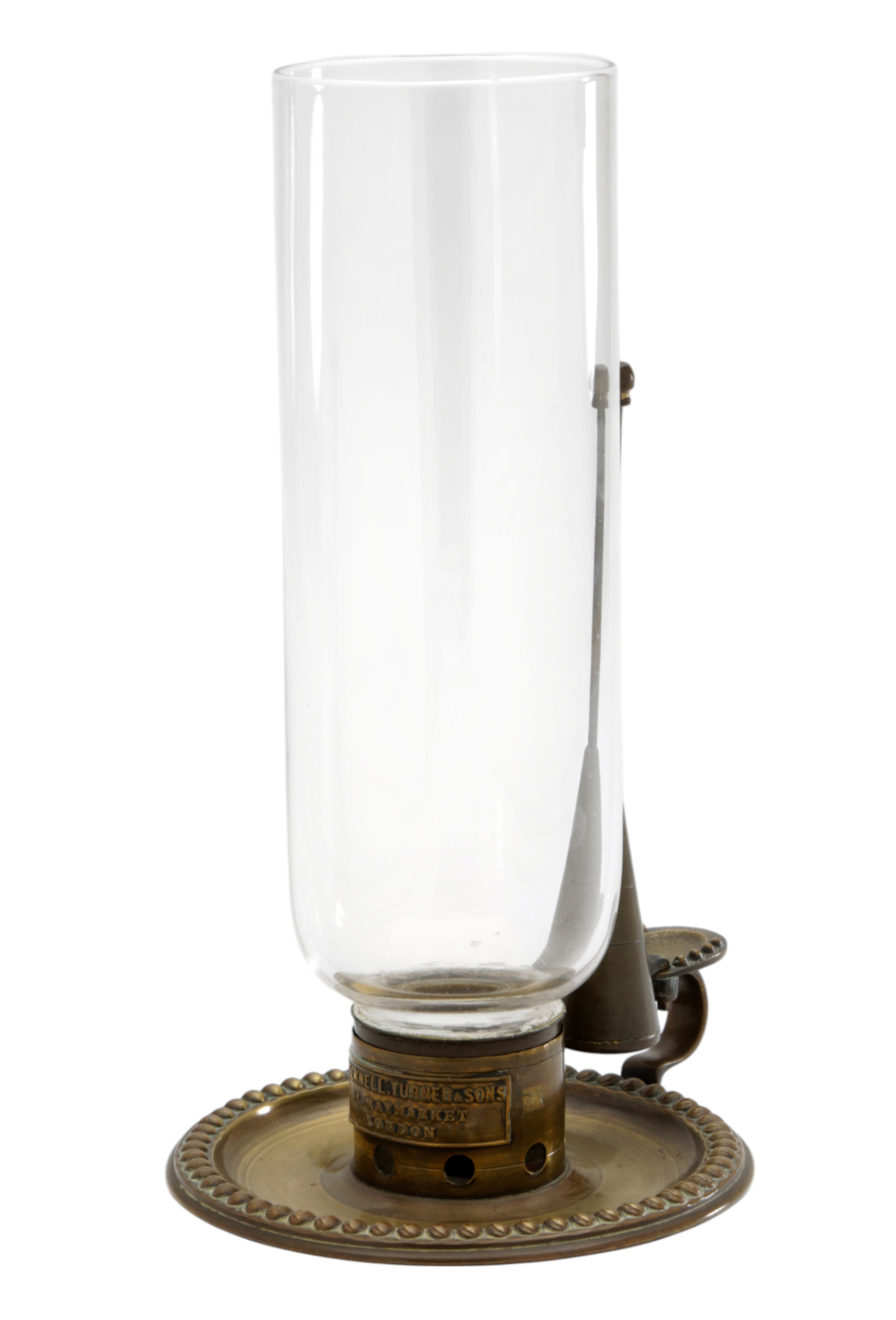 telescopic, spring-loaded and with a glass shade, together with a Victorian brass chamberstick, retailed by Brecknell Turner & Son, the circular tray base with beaded rim and scrolled handle, a glass storm shade and douter, brass plaque stamped 'BRECKNELL TURNER & SON, 31 HAYMARKET LONDON' to collar around socket (2)