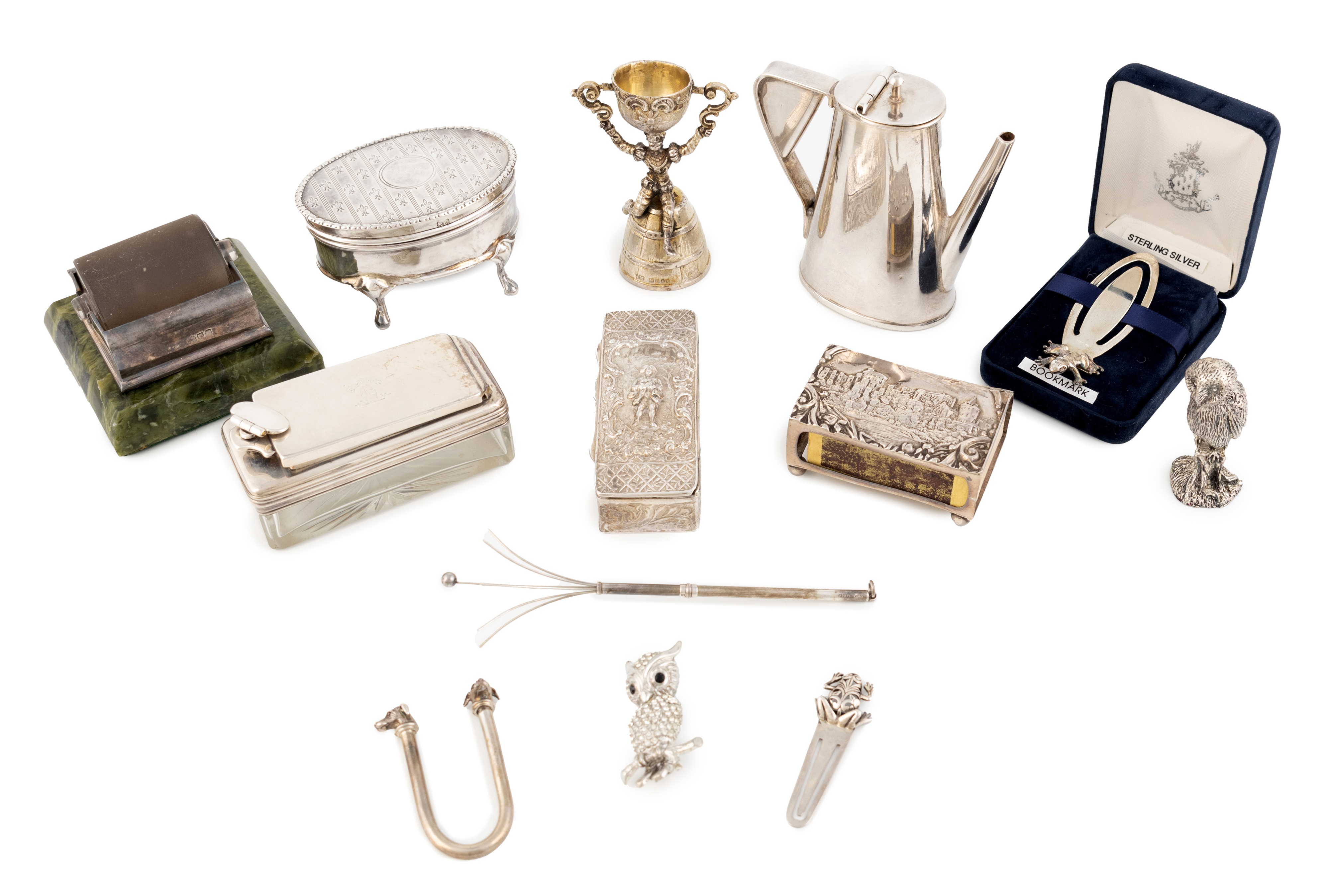 comprising: a William IV silver and glass travelling inkwell, by George Reid, London 1831, rectangular form, plus a small wager cup, with import marks for London 1897, a stamp moistener roller, London 1902, a Sarah Jones napkin ring, with two dog's heads, an oval dressing table box, a match box cover embossed with Windsor Castle, a box, a swizzle stick, two frog page markers, and an electroplated owl and miniature coffee pot, and an owl brooch, approx. weighable 5oz. (13)