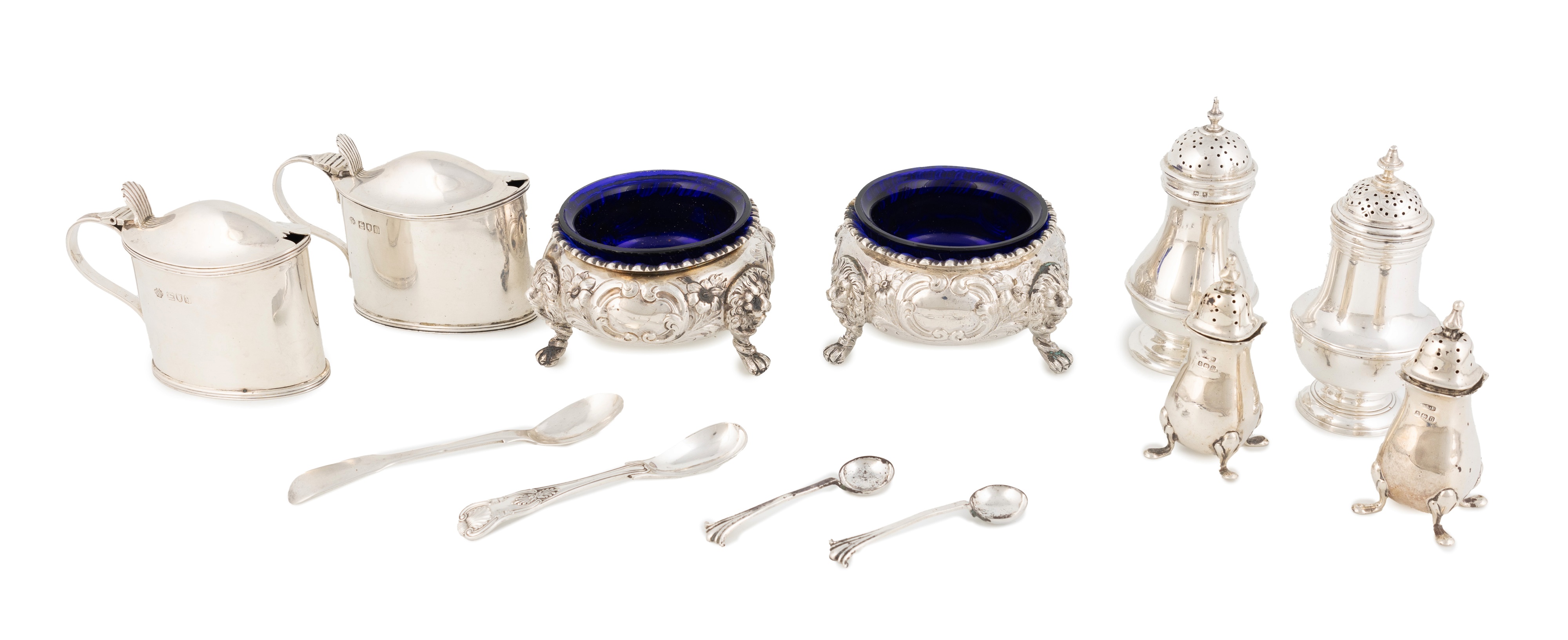 comprising: a pair of Victorian salt cellars by Henry Holland, London 1856, two mustard pots, four pepper pots, a pair of salt spoons, a mustard spoon and an electroplated mustard spoon, total approx. weighable 25.1oz. (12)