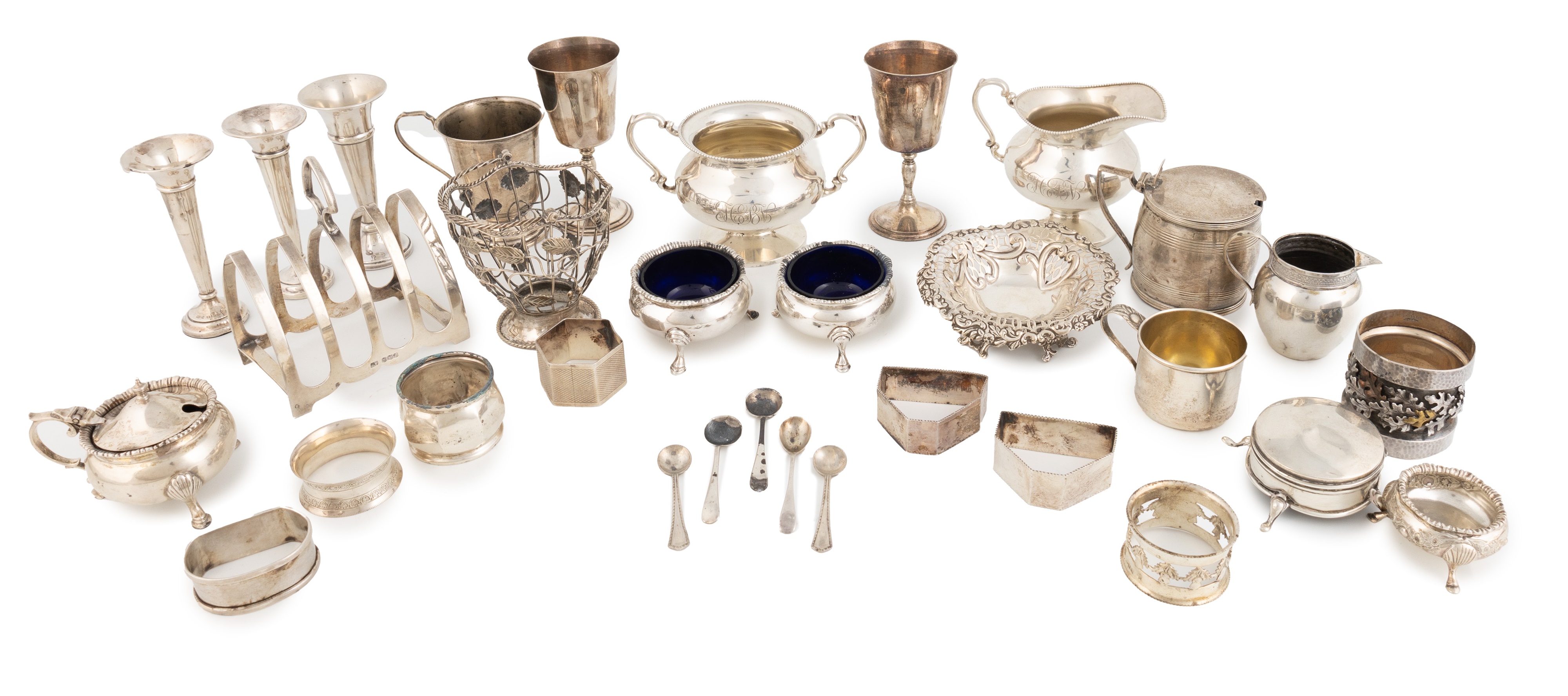 comprising: a George III mustard pot by John Emes, London 1804, two cream jugs, a sugar bowl, two goblets, a toast rack, three salt cellars, a mustard pot, eight napkin rings, two cups, a pierced dish, a swing-handled sugar basket, five salt spoons, a small dressing table pot and three small tulip vases, total approx. weighable 42.7oz. (qty)