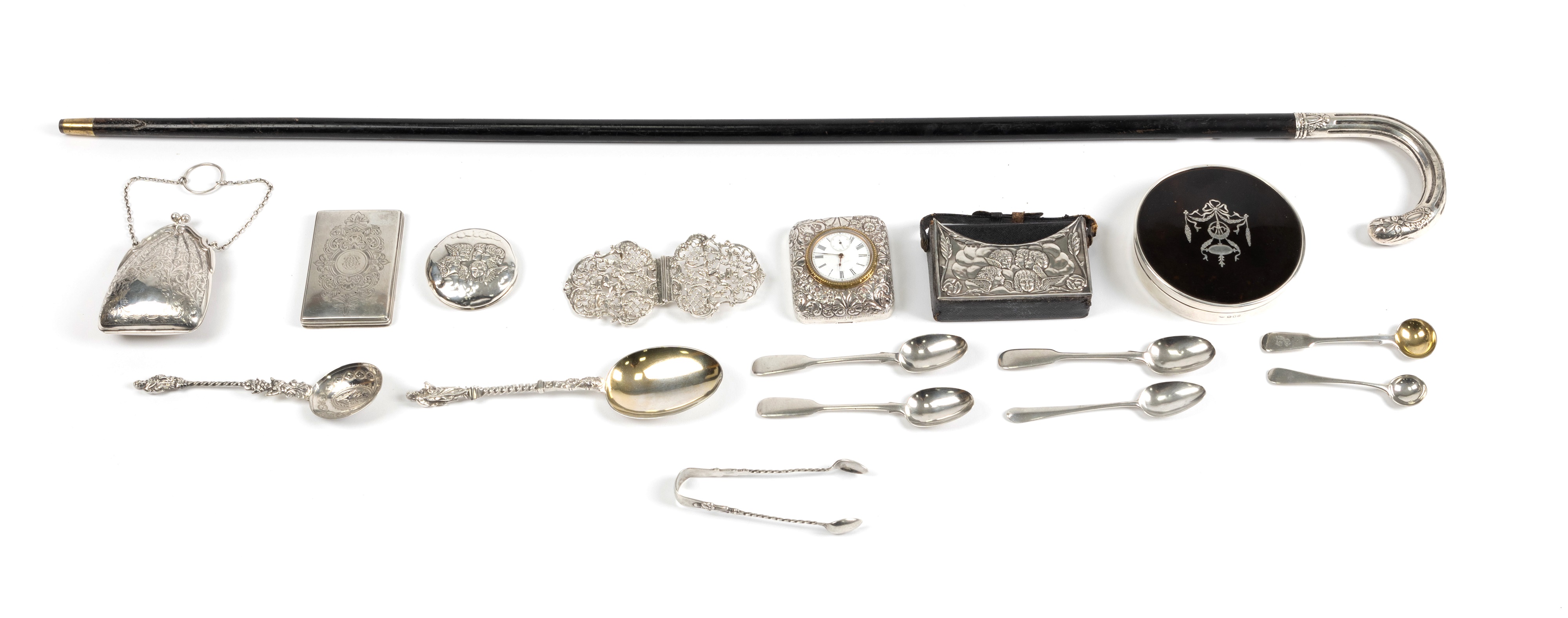 comprising: a silver-mounted walking stick, a purse, two lids, a belt hook, a silver-mounted clock, a memoranda and address book holder, four teaspoons, two salt spoons, a pair of sugar tongs, two modern apostle spoons and a silver-mounted tortoiseshell box, total approx. weighable 12.9oz. (17)