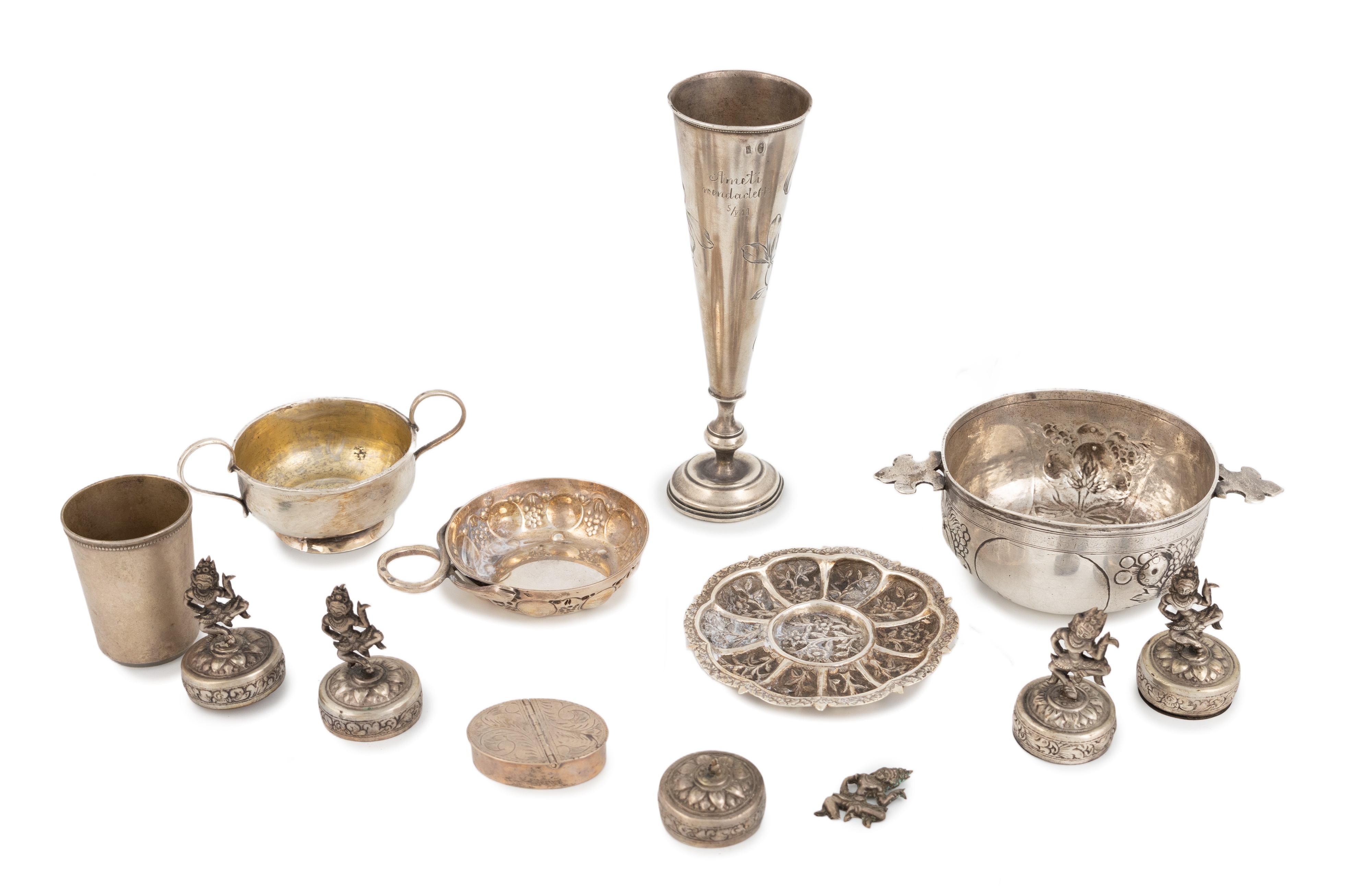 comprising: a Russian Kiddish cup, of tapering circular form, engraved decoration, a Russian vodka tot, a two-handled bowl, embossed decoration, a French wine taster, an unmarked two-handled drinking bowl, a foliate dish, five Cambodian menu card holders (one a/f), and an oval box. approx. weighable 9oz. (qty)