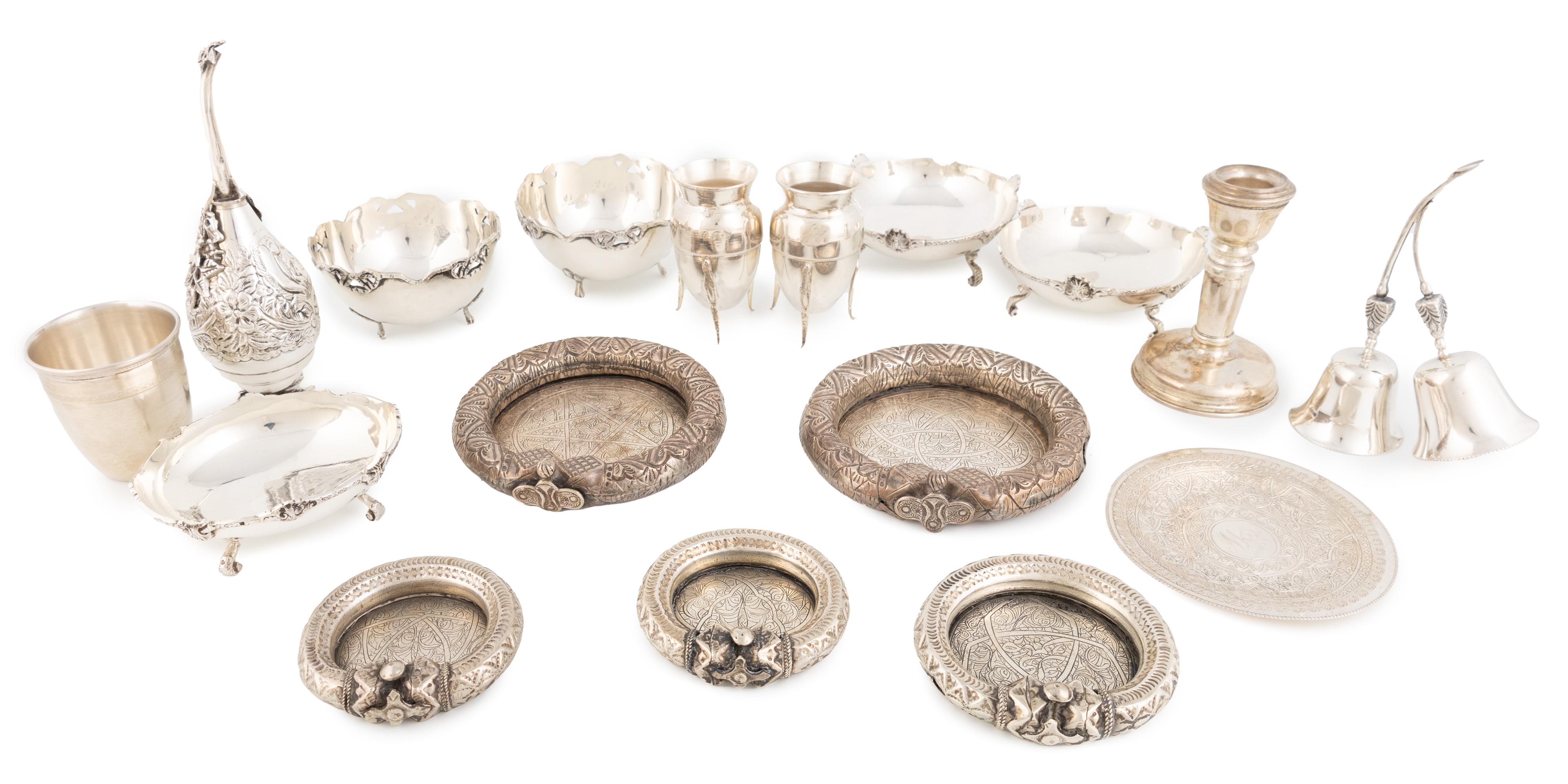 comprising: a pair of small bowls, circular form, on three scroll feet, a pair of dishes, a single dish, a beaker, a bell, a rosewater sprinkler, a pair of anklet dishes and three bracelet dishes, a candlestick, and a dish, and a pair of metalware vases, unmarked, approx. weighable 58oz. (qty)