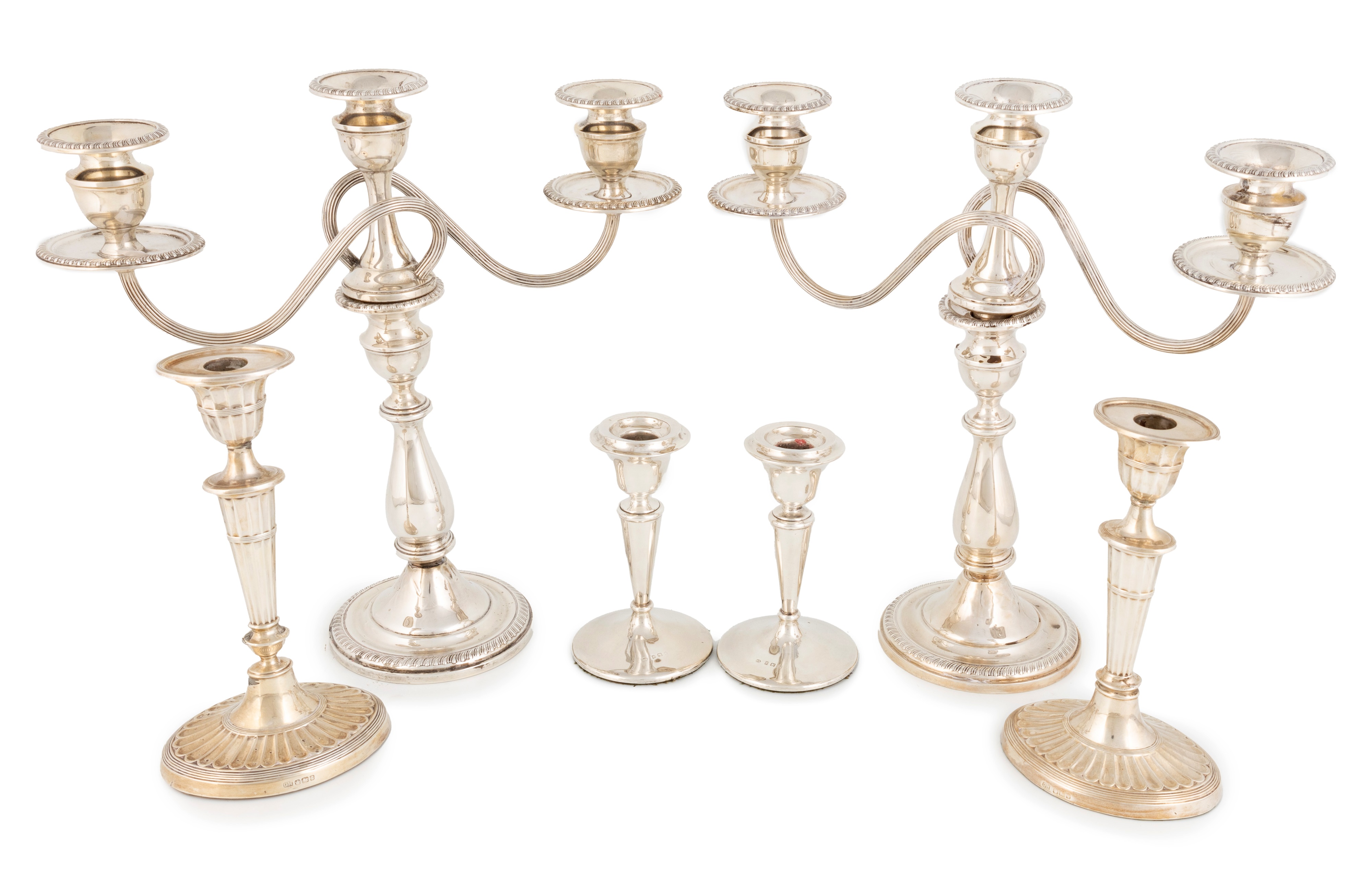 tapering fluted form with reeded borders, on loaded oval bases, plus a pair of silver candlesticks and a pair of candelabras, approx. weight of branches 28.9oz. (6)