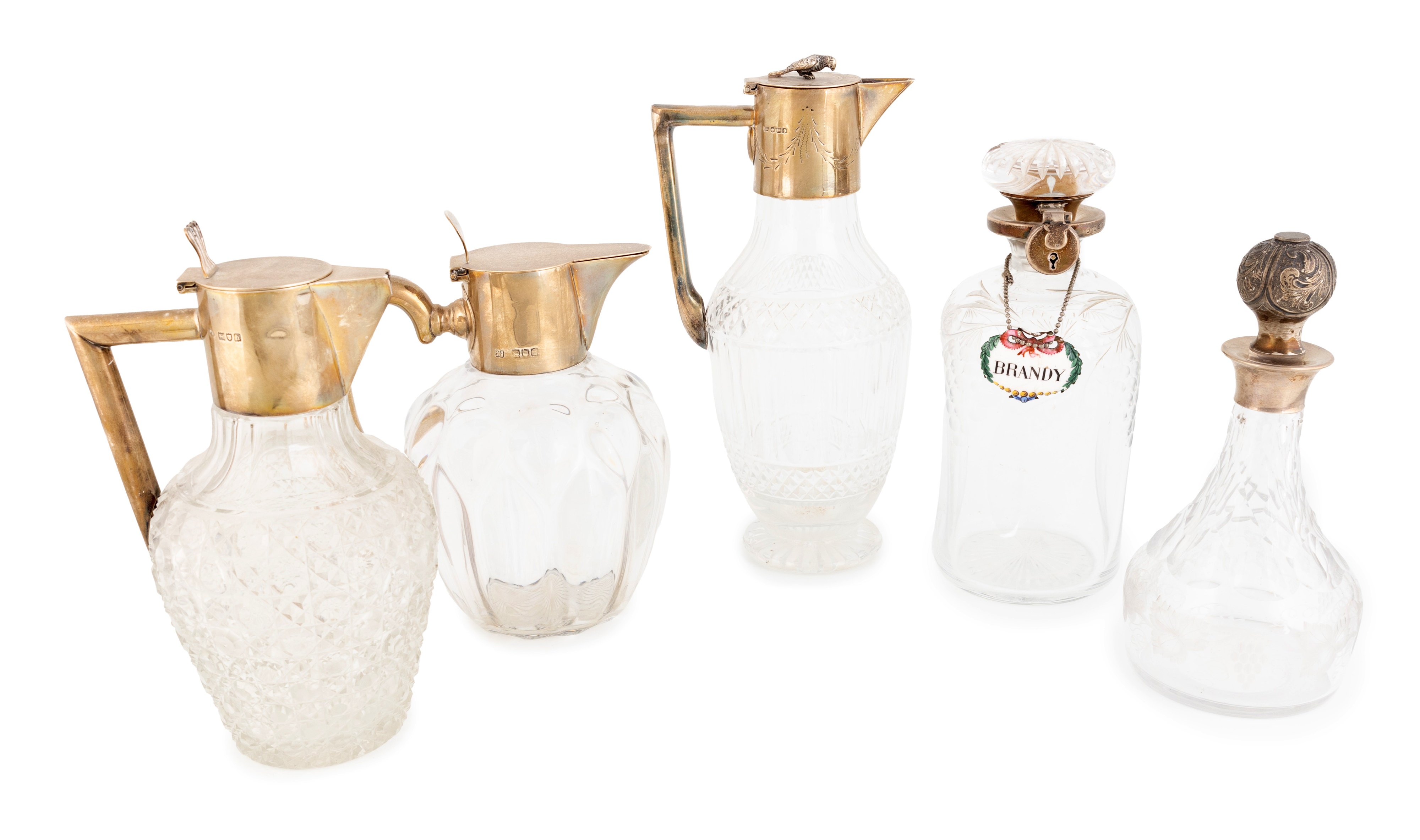 comprising: an Edwardian silver-mounted claret jug, by Heath and Middleton, London 1902, lobed baluster glass body, plain mount, plus an Edwardian claret jug, London 1903, and another claret jug, plus a lockable decanter (no key), and another silver-mounted decanter, plus an enamel wine label. (6)