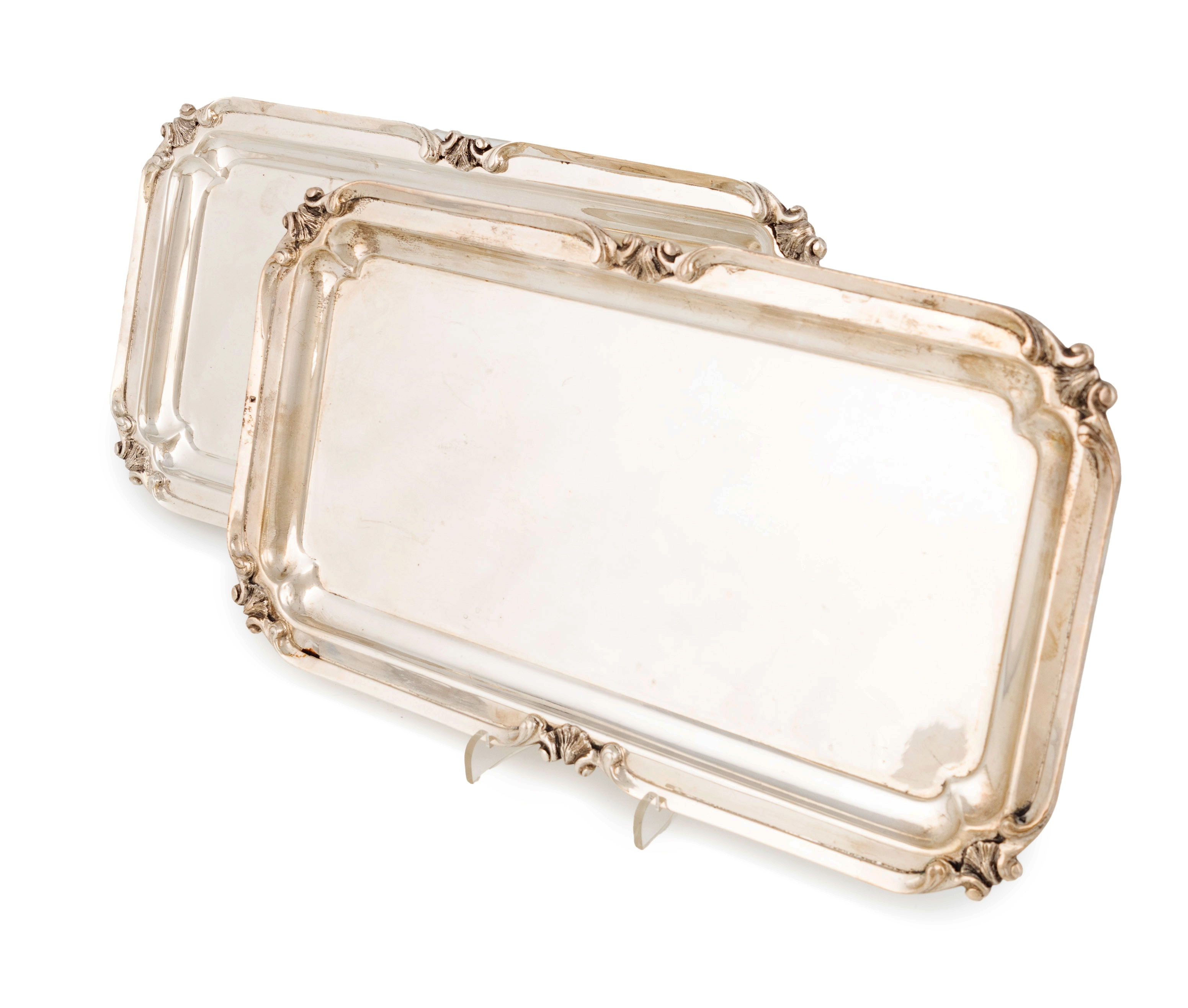rectangular form, shell and scroll border, length 30.8cm, approx. weight 32oz. (2)