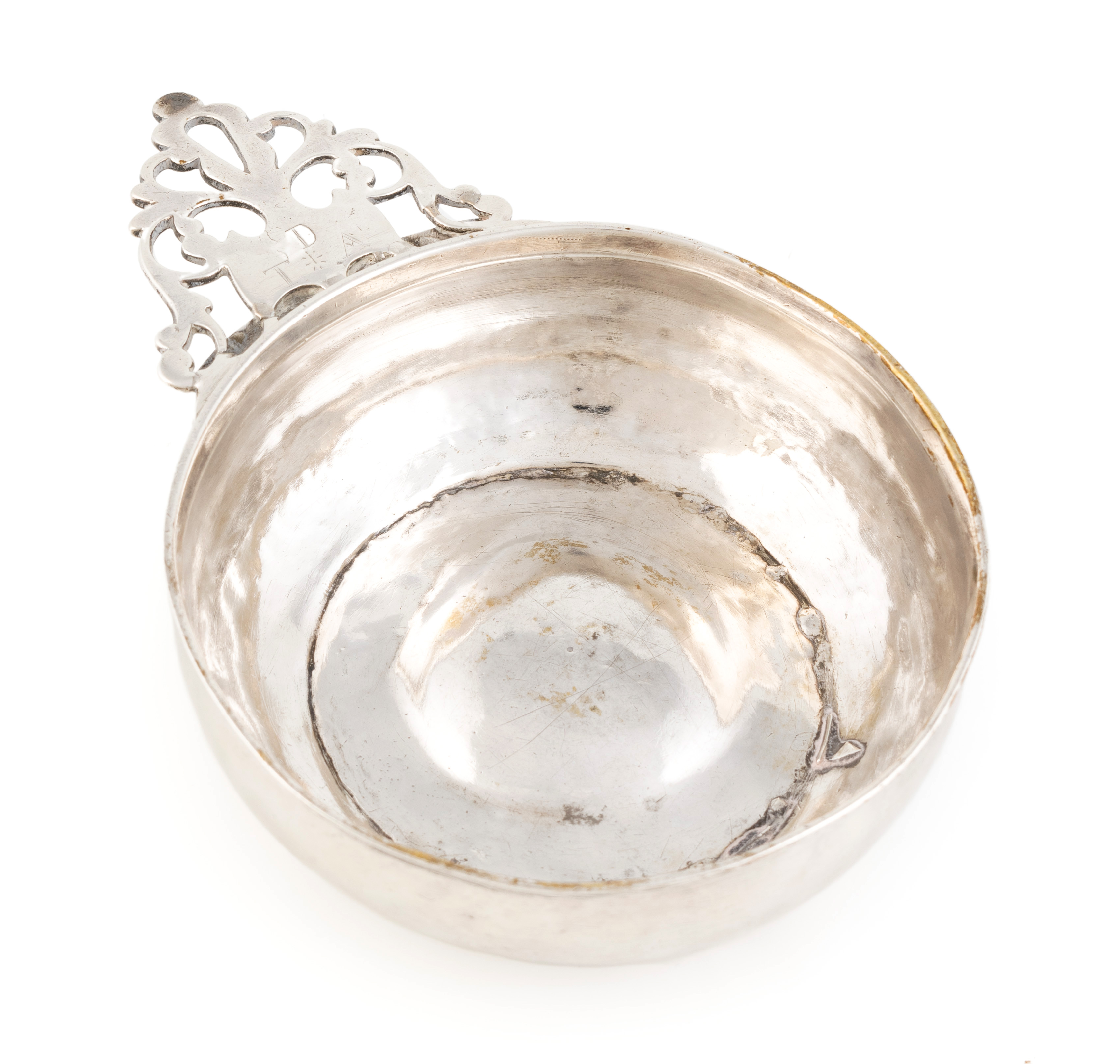 circular bowl, the handle with pierced decoration, scratch initialled 'D' over 'T*A', repaired, length 19.2cm, approx. weight 6.8oz.