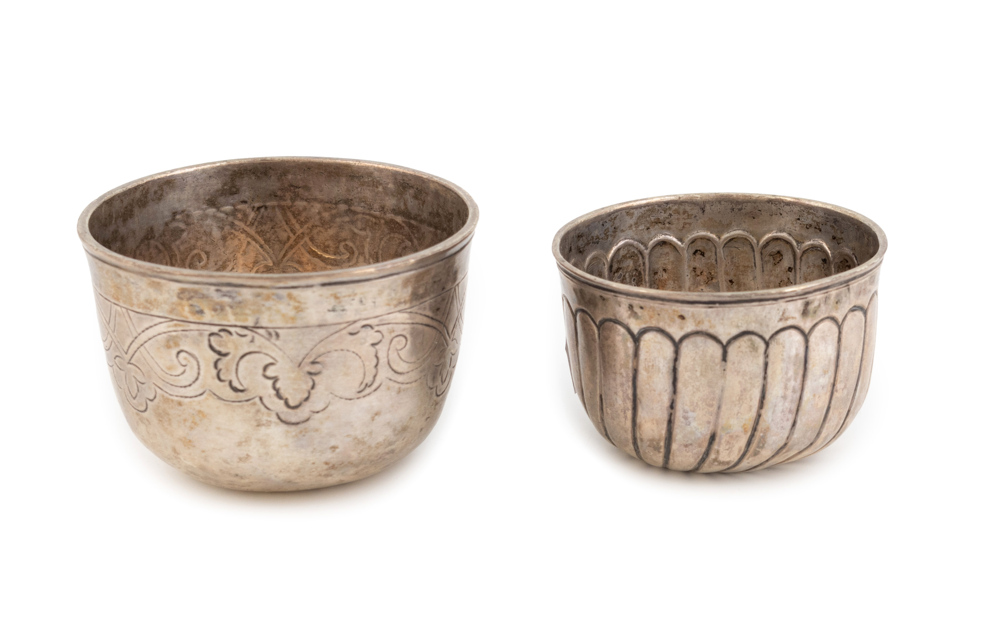 circular form, part-fluted decoration, plus another 18th century Russian silver vodka cup, maker's mark AS, circular form, chased foliate decoration, approx. weight 2oz. (2)
