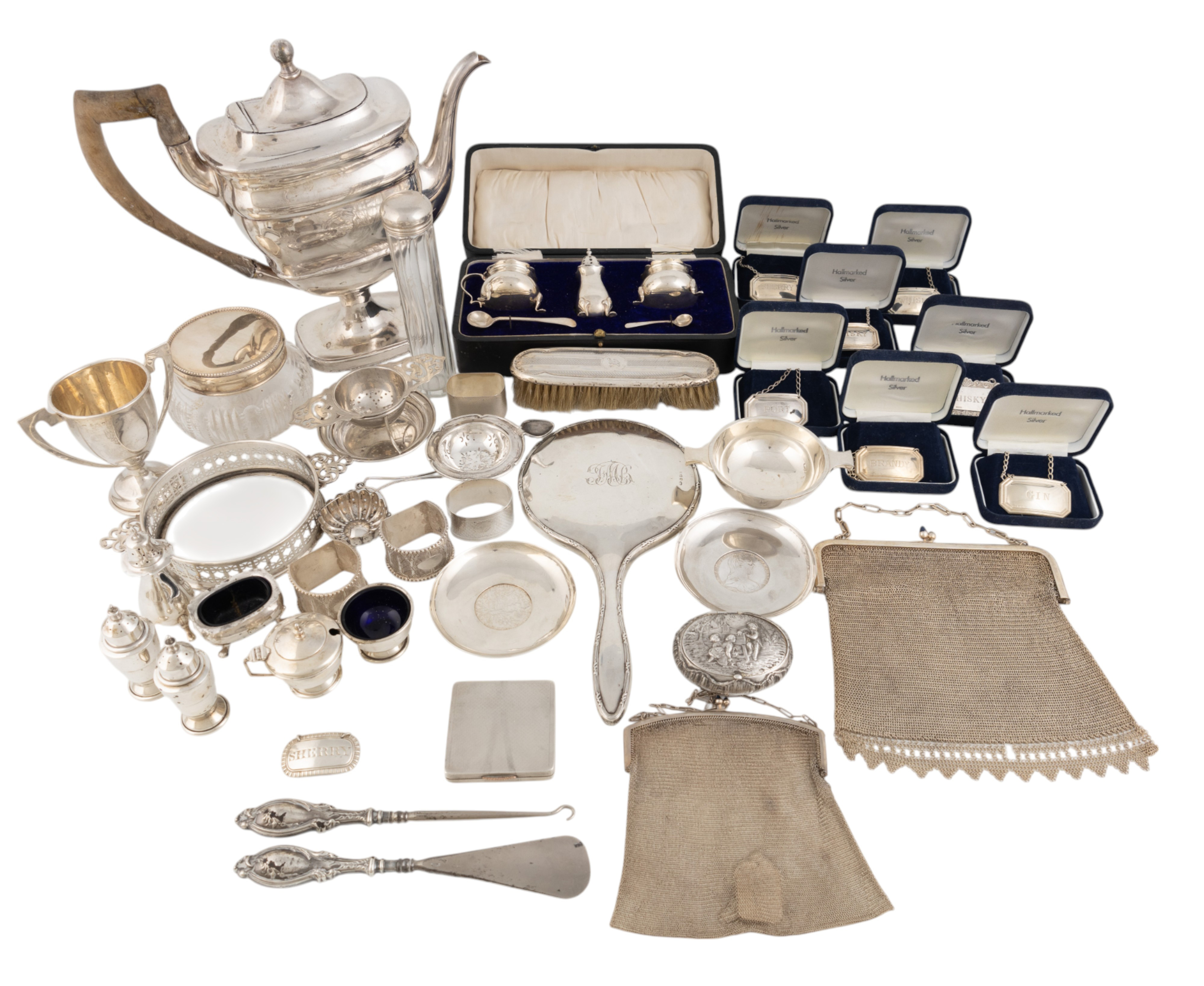 comprising silver items: a cased three-piece condiment set, Birmingham 1919, a Scottish quaich, a butterdish mount, (no liner), a mesh bag, a trophy cup, a four-piece condiment set, a pepper, a salt, a compact, a tea strainer and stand, another tea strainer, a wine label, London 1822, incised 'Sherry', seven modern wine labels, cased, a continental tobacco box, two toilet jars, two napkin rings, a mirror and a button hook, plus metalware items: a pair of napkin rings, and two dishes set with coins, and an electroplated chain mesh bag, tea strainer and an old Sheffield plated coffee pot, approx. weighable 35oz. (qty)