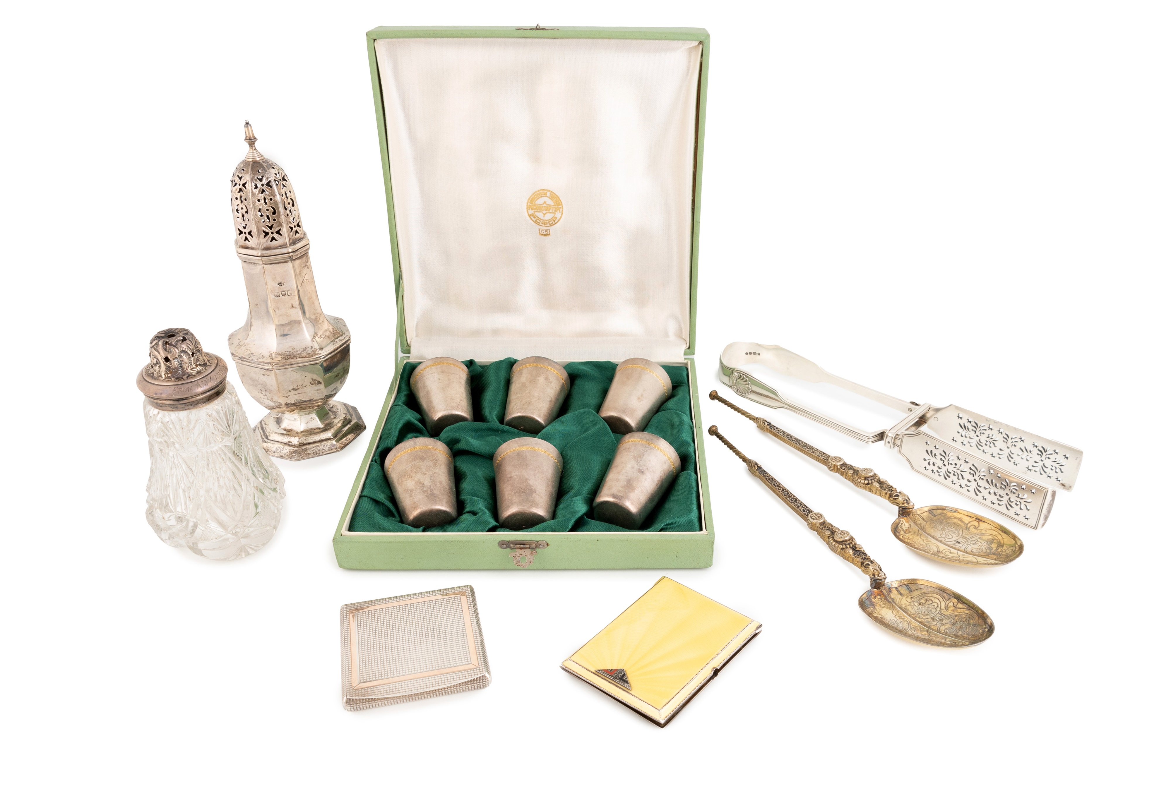 various dates and makers, comprising: a pair of Victorian Fiddle, Thread and Shell pattern asparagus serving tongs, by George Adams, London 1848, two large silver-gilt anointing spoons, London 1902, a sugar caster, a silver-mounted glass sugar caster, a compact, a silver and yellow enamel cigarette case, (push button a/f), and a set of six Russian electroplated and gilded vodka beakers, tapering circular form, in a fitted case, approx. weighable 26oz. (qty)