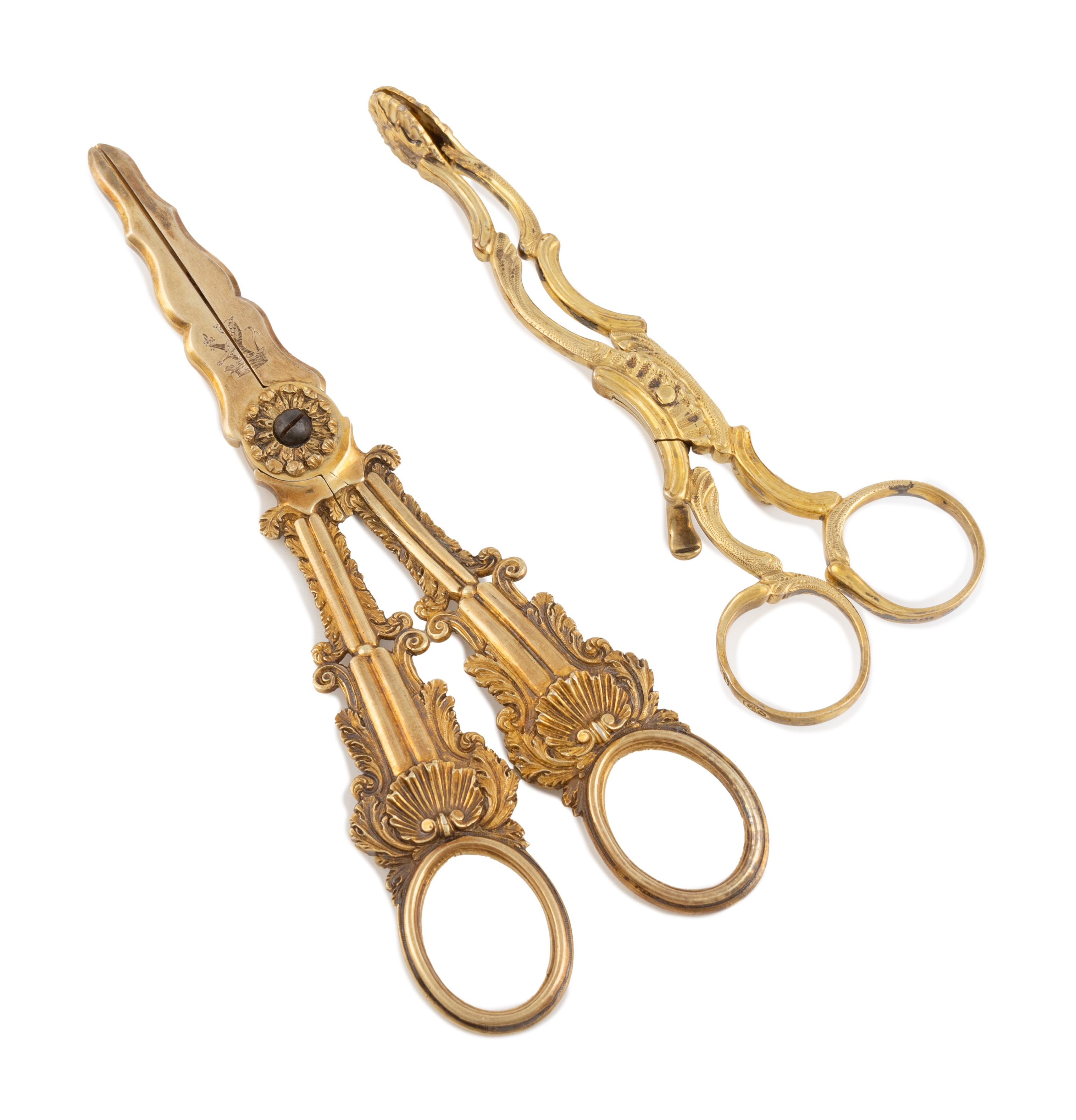foliate and shell decoration, ring handles, engraved with a crest, length 16.5cm, plus a pair of silver-gilt tongs, possibly Lisbon, maker's mark GK, scroll arms, rocaille bowls, ring handles with two scroll supports, approx. total weight 5.2oz. (2)