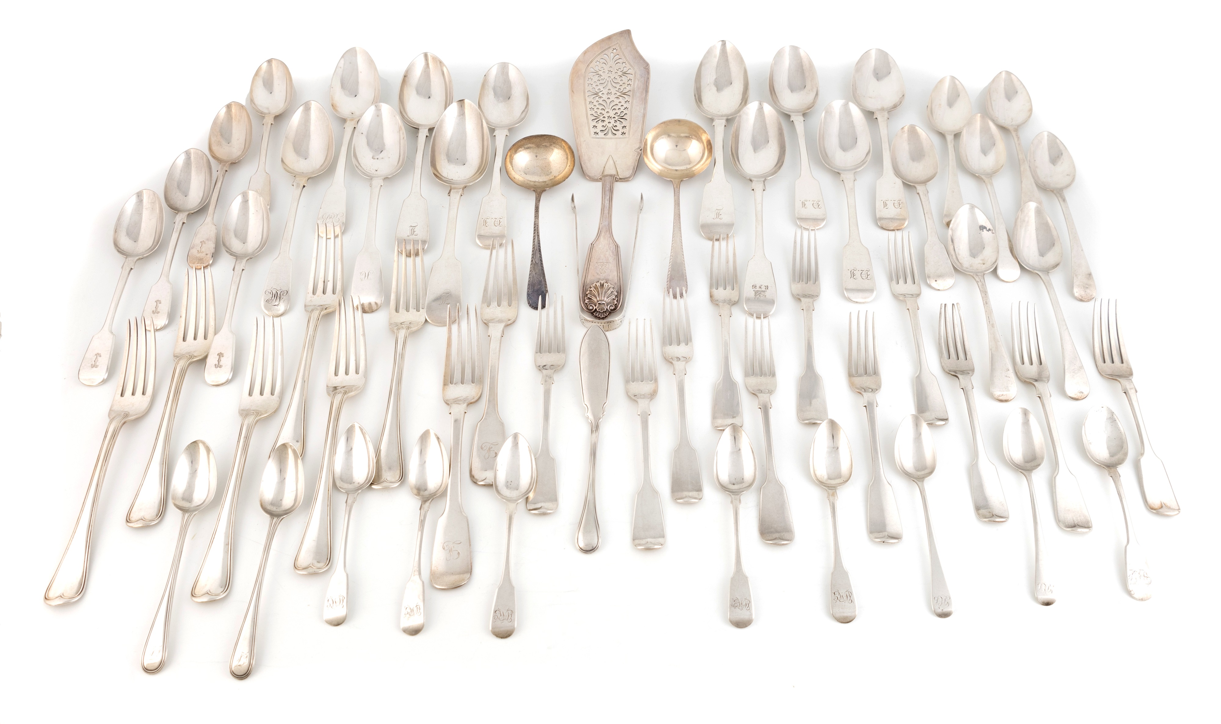 comprising: a William IV Fiddle, Thread and Husk pattern fish slice, by William Traies, London 1832, a set of six Old English Thread pattern table forks, London 1877, plus eleven tablespoons, eleven dessert forks, two table forks, twelve dessert spoons, ten teaspoons, a pair of sugar tongs, a butterknife, and two sauce ladles, approx. weight 95oz. (qty)