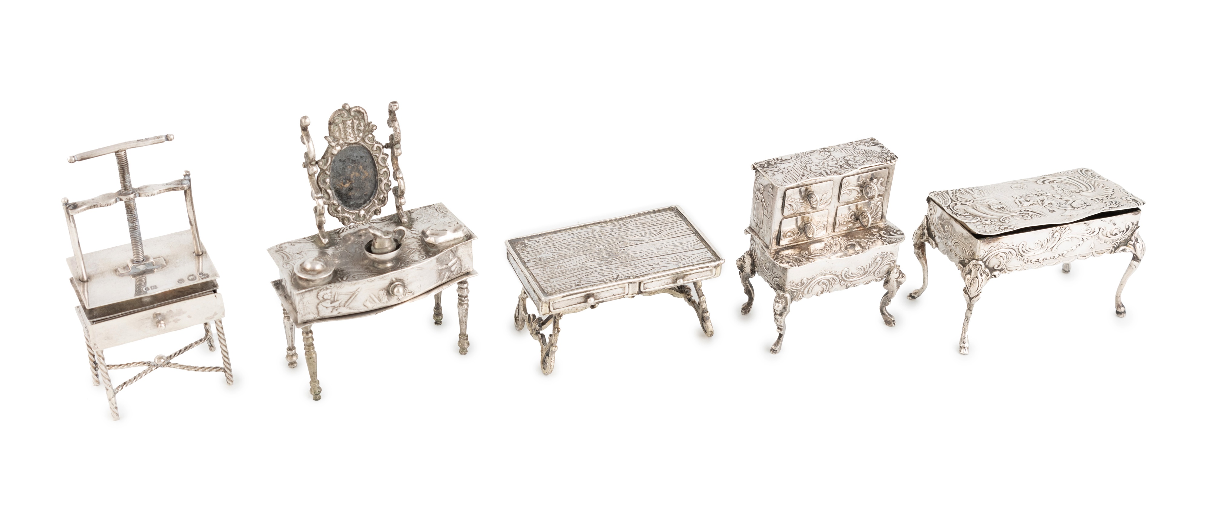 comprising: a Dutch silver lowboy, importer marks for Samuel Landeck, Sheffield 1898, a Dutch press, importer marks for Isaac Manheim, London 1903, a German lowboy, importer marks for Singleton, Benda & Co Ltd, London 1904, a Dutch dressing table with pseudo marks and an Italian desk, total approx. weight 16.5oz (5)