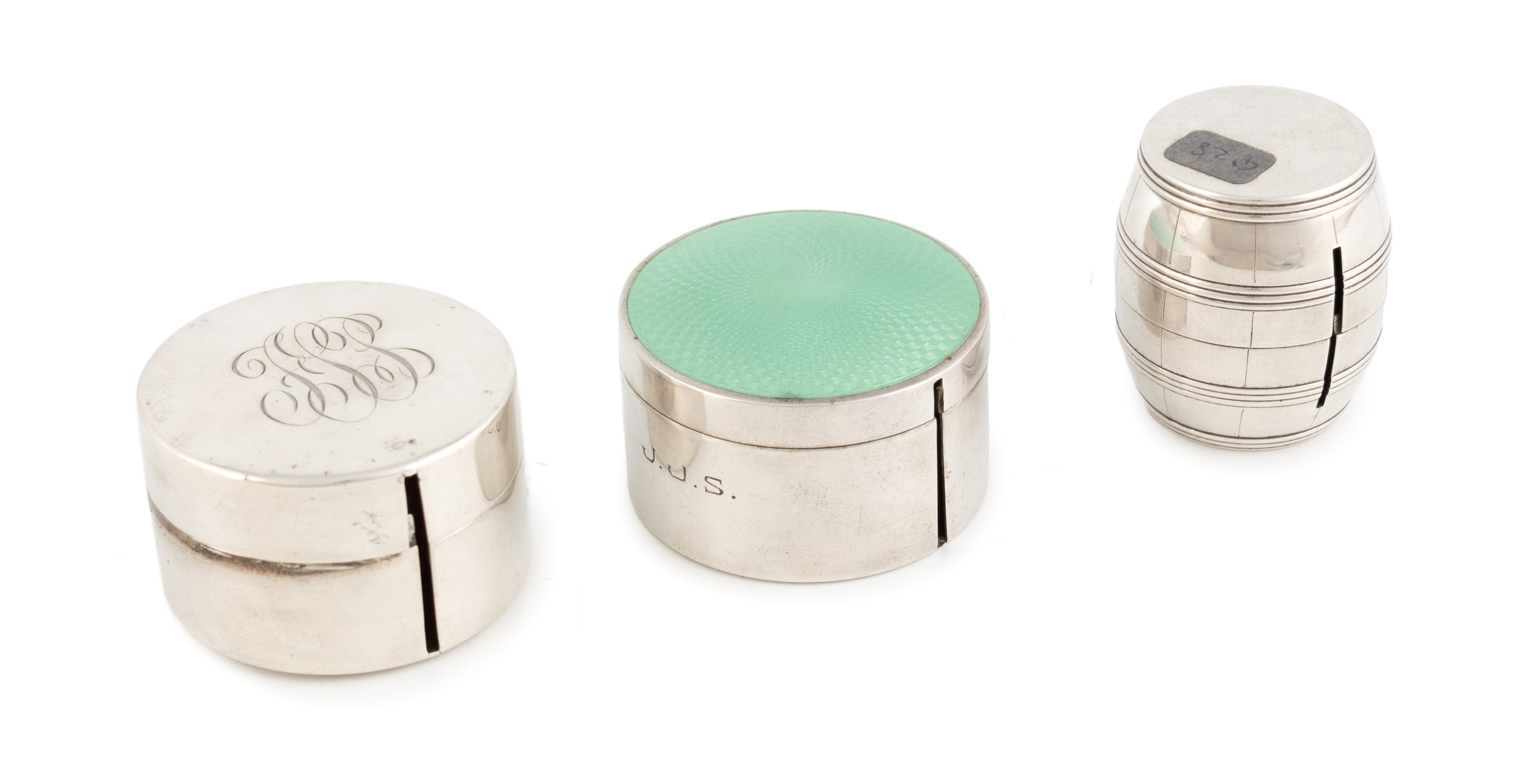 in the form of a barrel with a screw-off bottom and pierced slit to the side, plus a an American silver stamp dispenser by Battin & Co, Newark circa 1904, circular form with engraved initials to the cover, and American silver stamp dispenser, no apparent maker's mark, circular form with an enamelled cover and engraved initials, total approx. weight 4.9oz. (3)