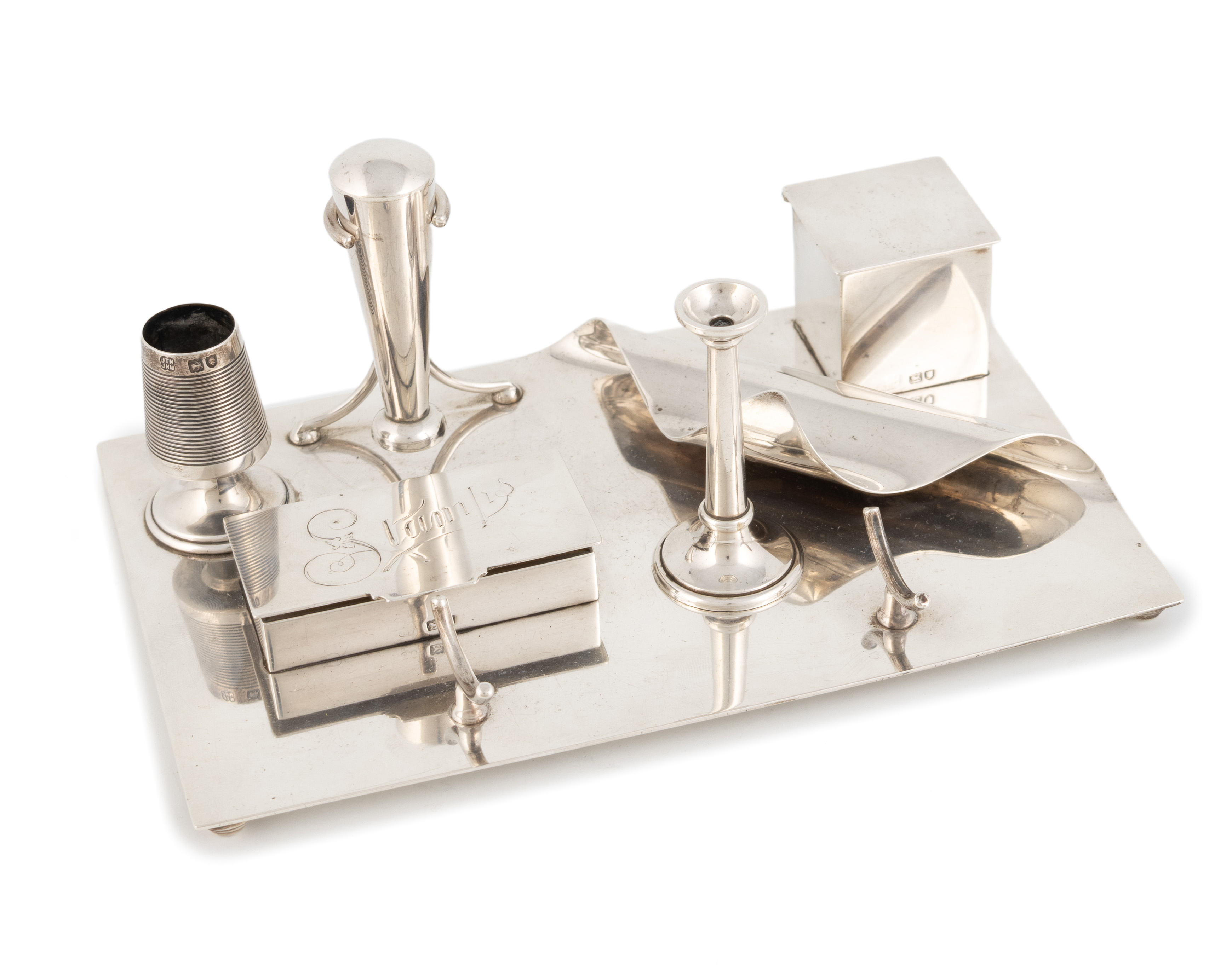 rectangular form, cube-formed inkwell, a stamp box, the hinged cover inscribed 'Stamps', a vesta holder and striker, with a desk seal and taper sticks, with a curled page motif pen tray, length 18.7cm, approx. weight 16.3oz.