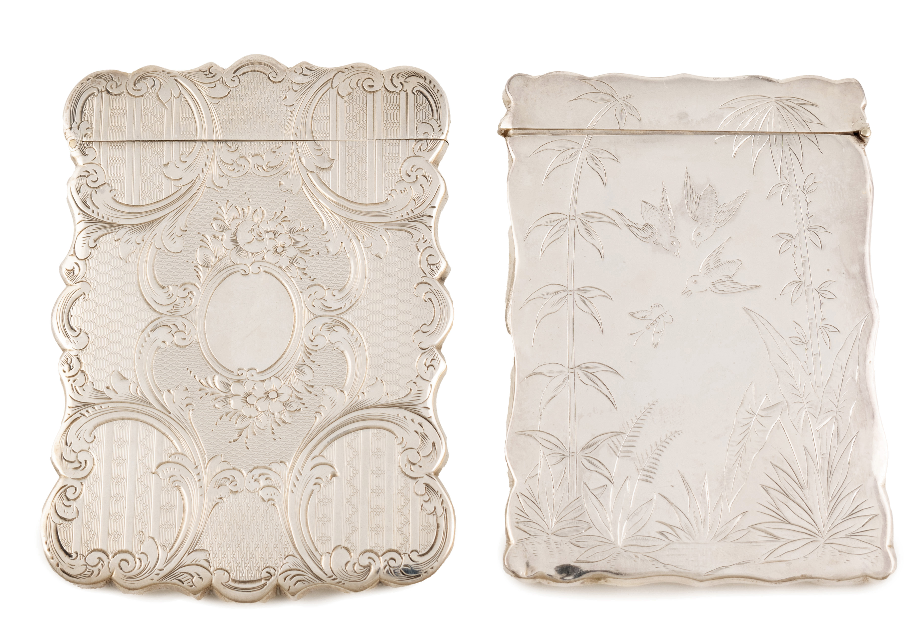 engraved foliate and engine-turned decoration, length 10cm, plus a Victorian silver Aesthetic Movement card case, by Hilliard and Thomason, Birmingham 1881, rectangular form, engraved swallows, butterflies and foliate decoration, length 9.2cm, approx. total weight 3.4oz. (2)