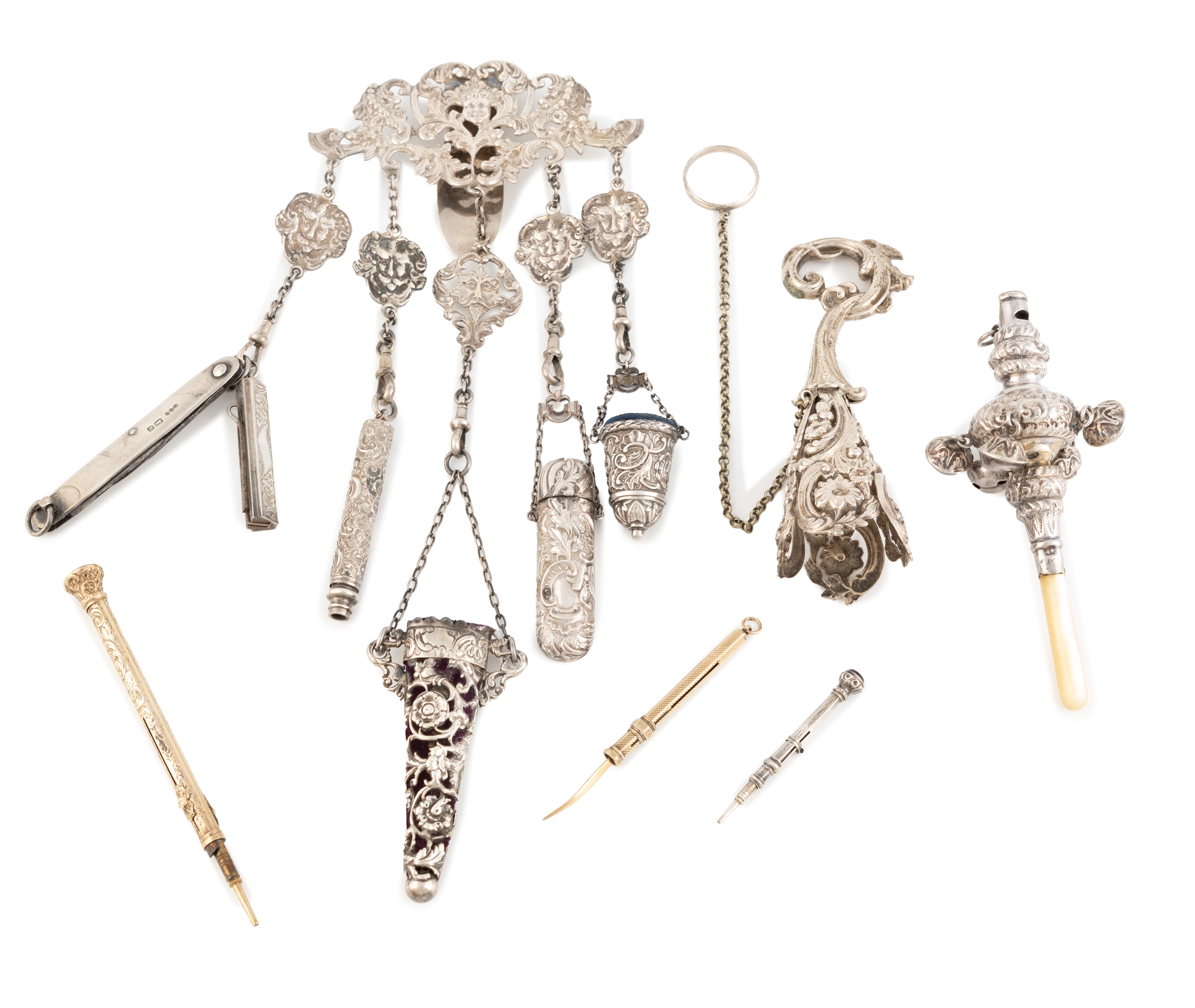 comprising silver items: a Victorian chatelaine clip, London 1888, pierced foliate scroll and mask decoration, with five hanging chains with five attachments, plus a late-Victorian baby's rattle and whistle, Birmingham 1887, and a small retractable pencil, plus a 10 carat gold tooth pick, by S. Mordan and Co., and a gilt metal combination pen and pencil, with engraved decoration and an electroplated posy holder, approx. weighable 4.6oz, approx. weight of gold 3.8g. (6)
