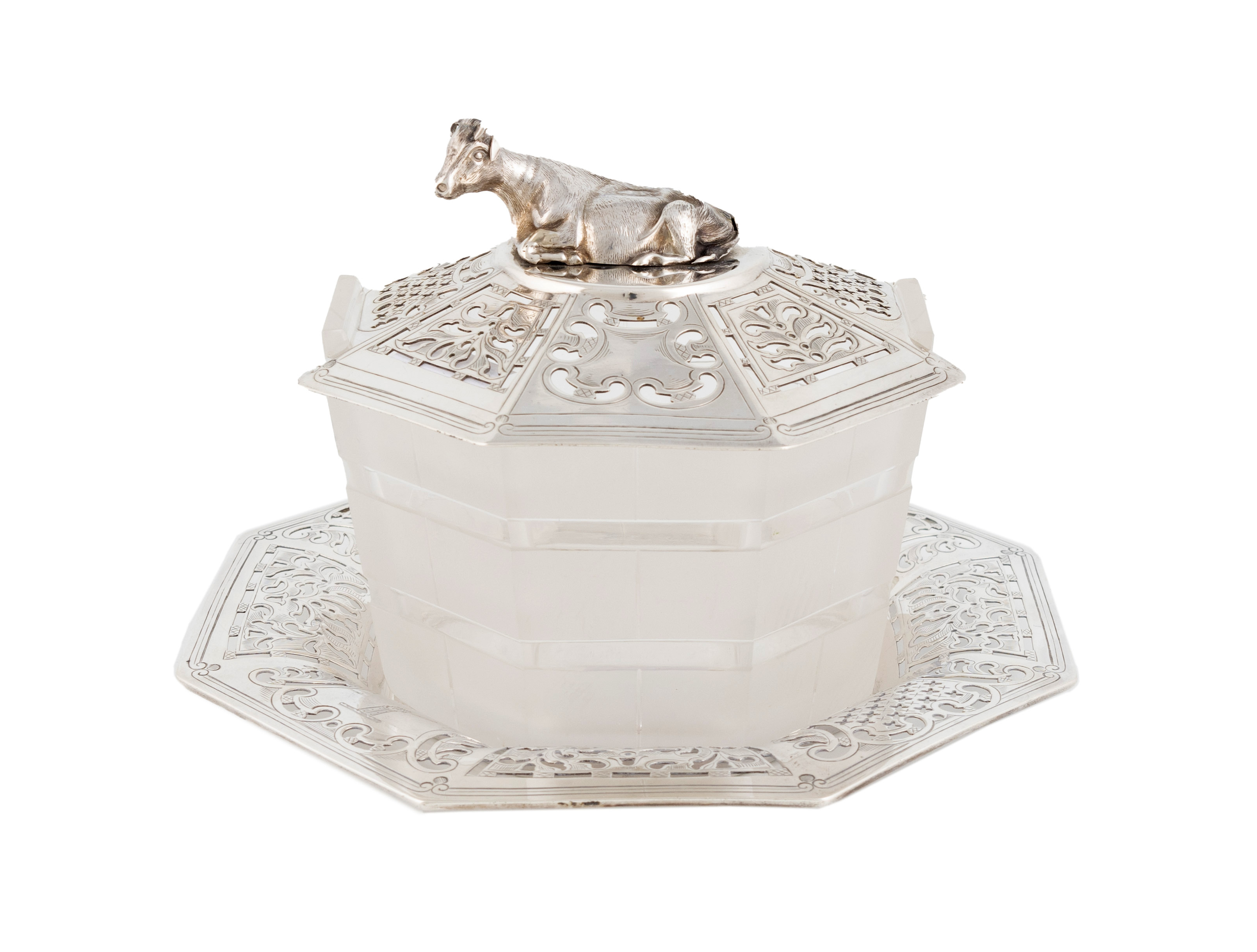 octagonal form, pierced scroll and mullet decoration, frosted glass tub body, the pull-off cover with a recumbent cow finial, engraved with a crest, diameter of base 17.5cm, approx. weight 8.5oz.