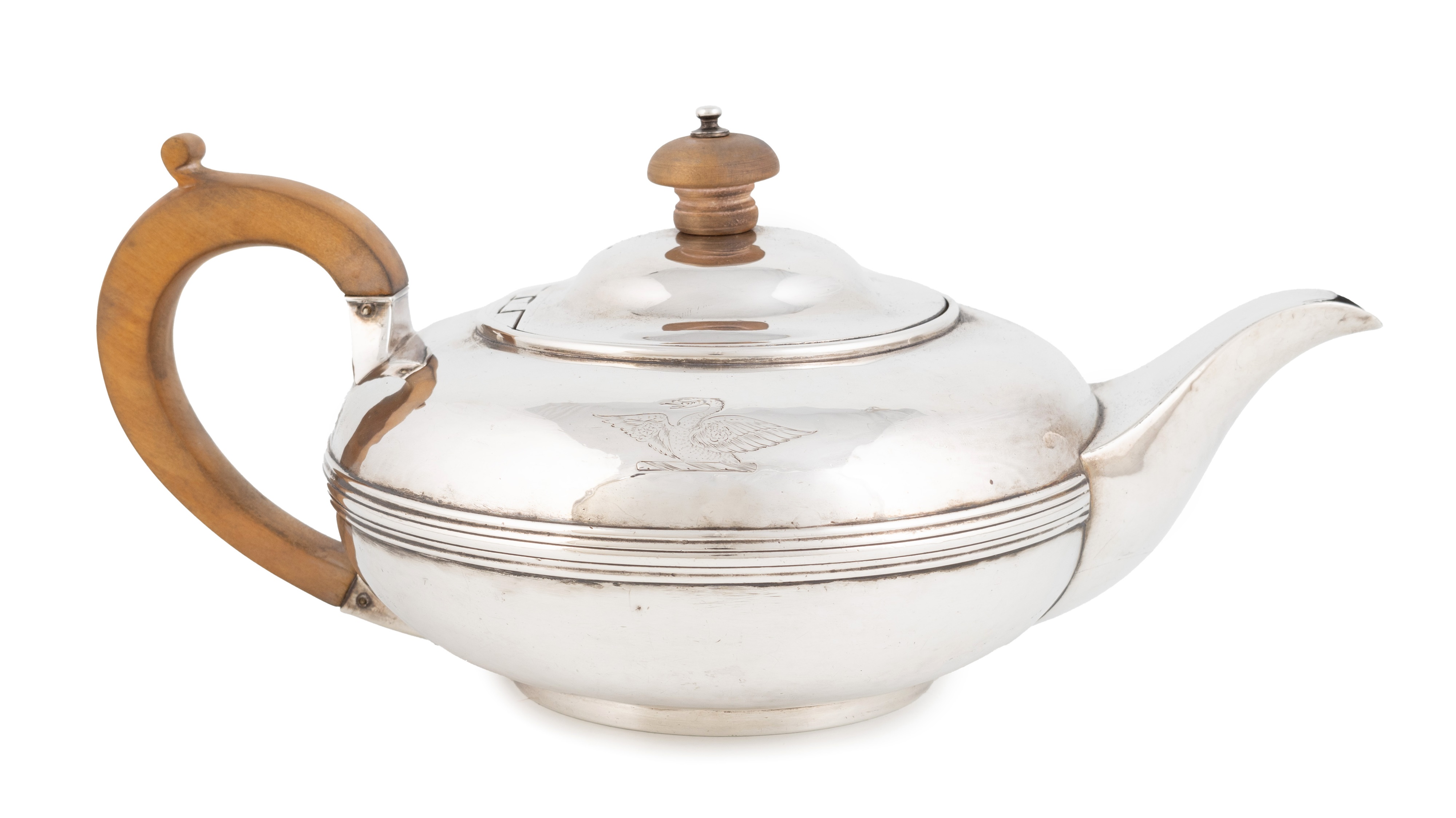 compressed circular form, wooden scroll handle and finial, engraved with a crest, length handle to spout 26.8cm, approx. weight 18oz.