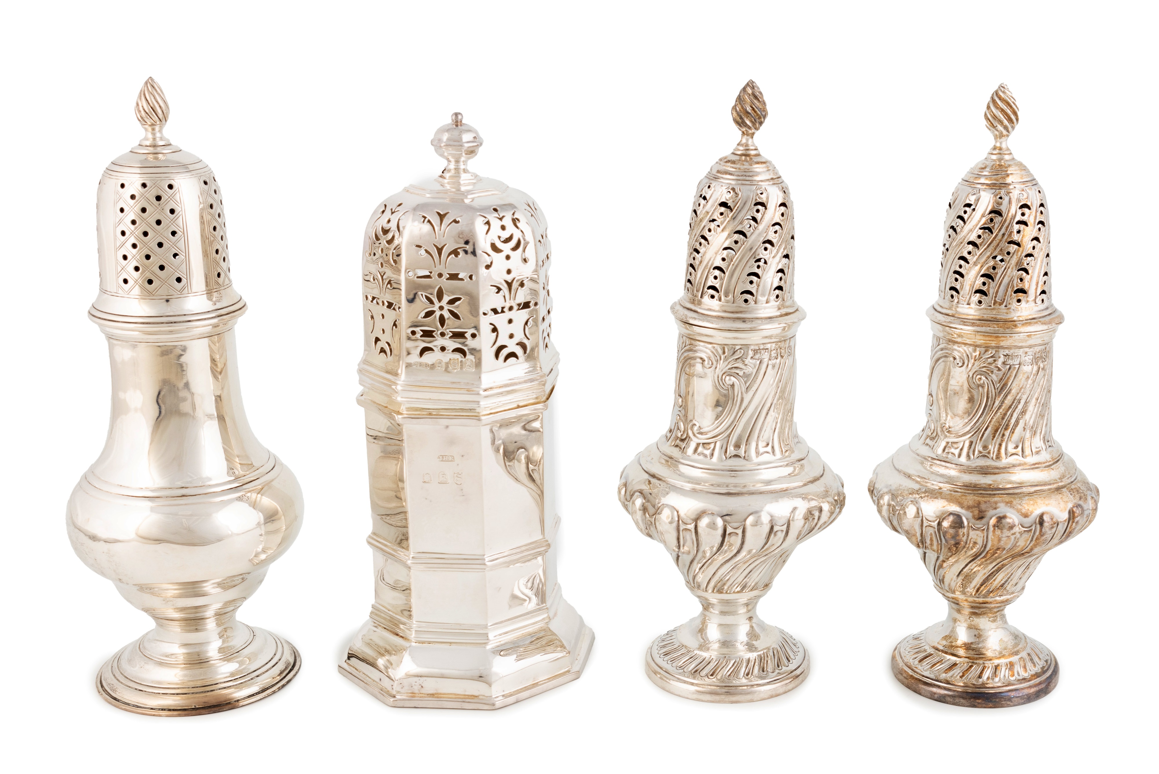 A small collection of four silver sugar casters,