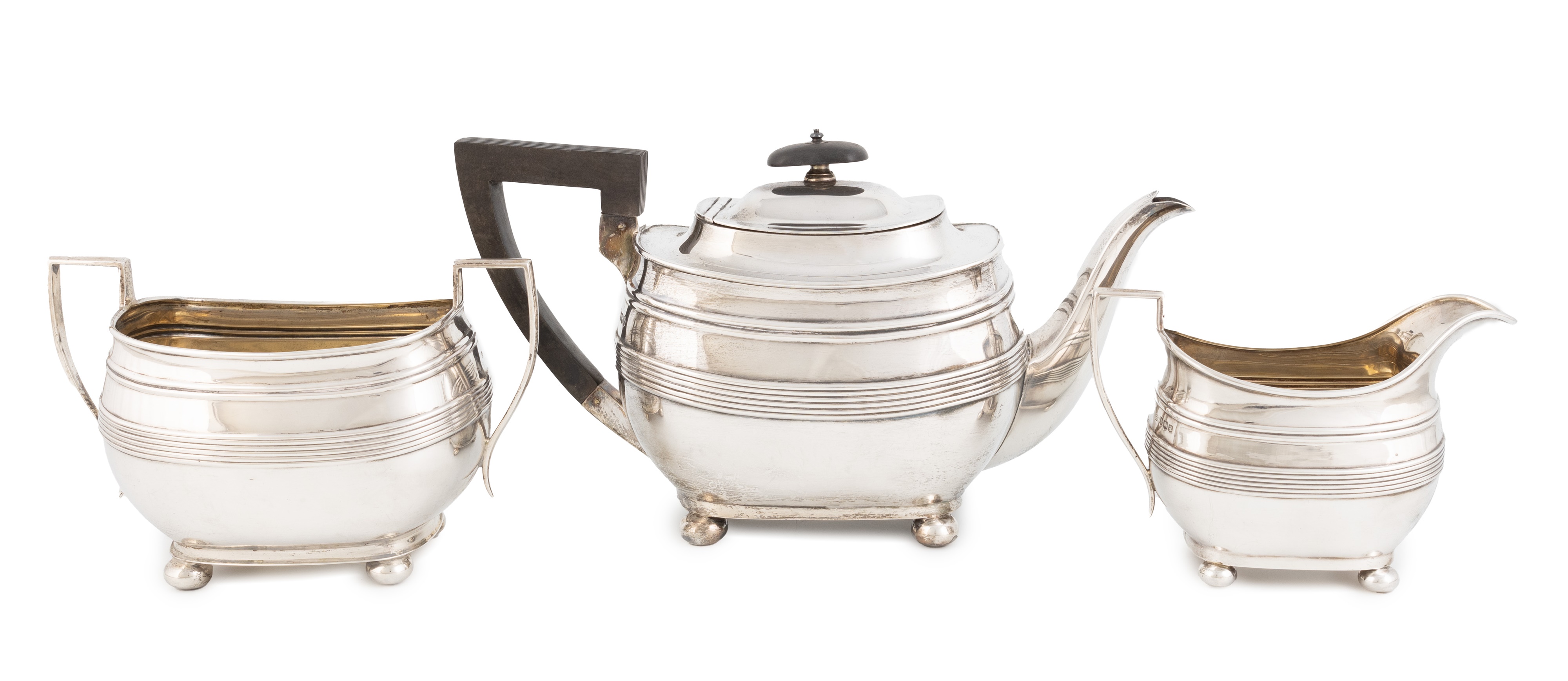 oblong bellied form, fluted girdle, length handle to spout 27cm, approx. weight 29.5oz. (3)