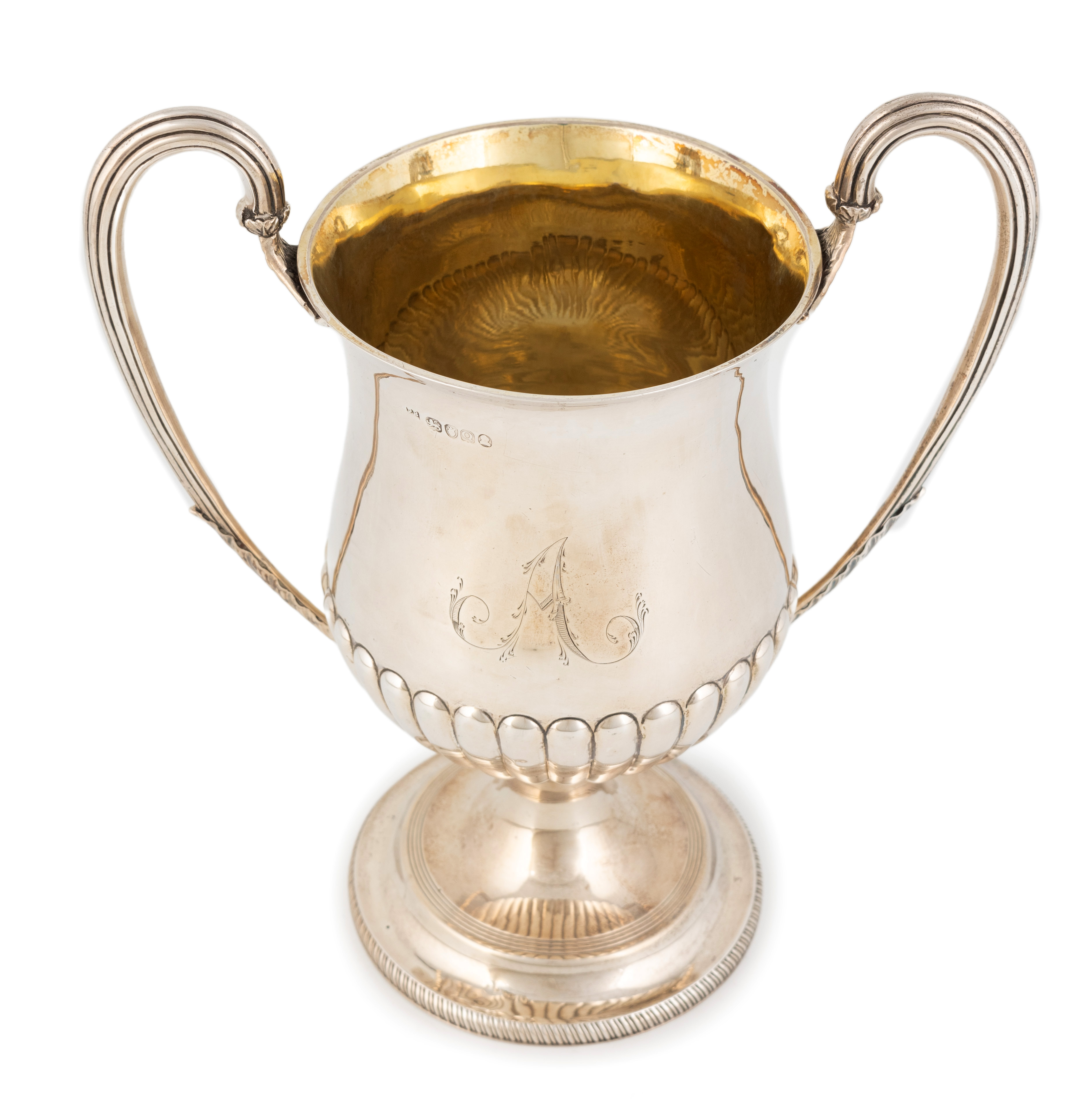 baluster form with part-fluted decoration, two reeded scroll handles, engraved initial, on raised circular foot, height 24.4cm, approx. weight 18oz.
