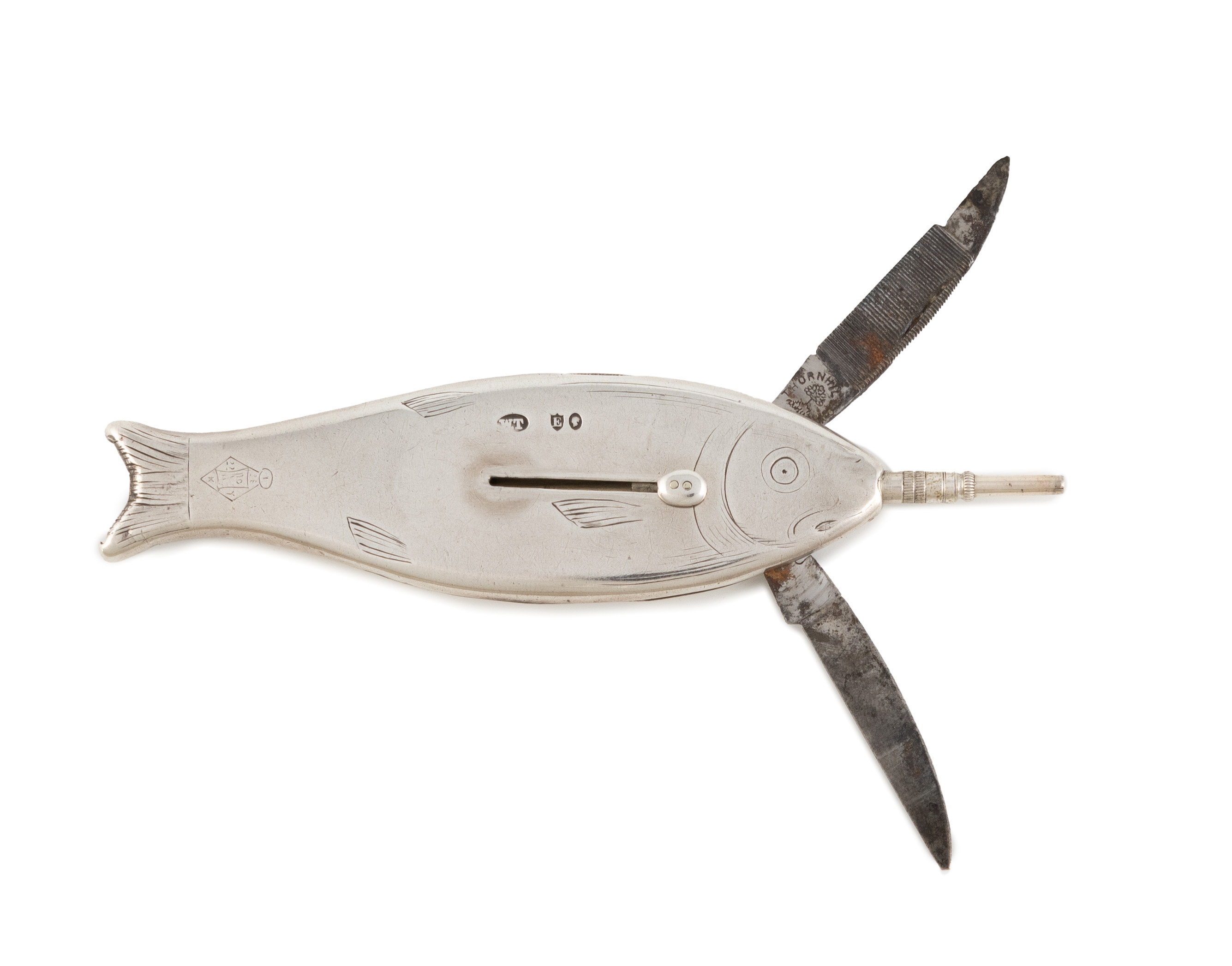 of fish form with engraved decoration, two fold-out knives one with a striker, a pencil and a whistle, length 8.4 cm, approx. weight 1.1oz.