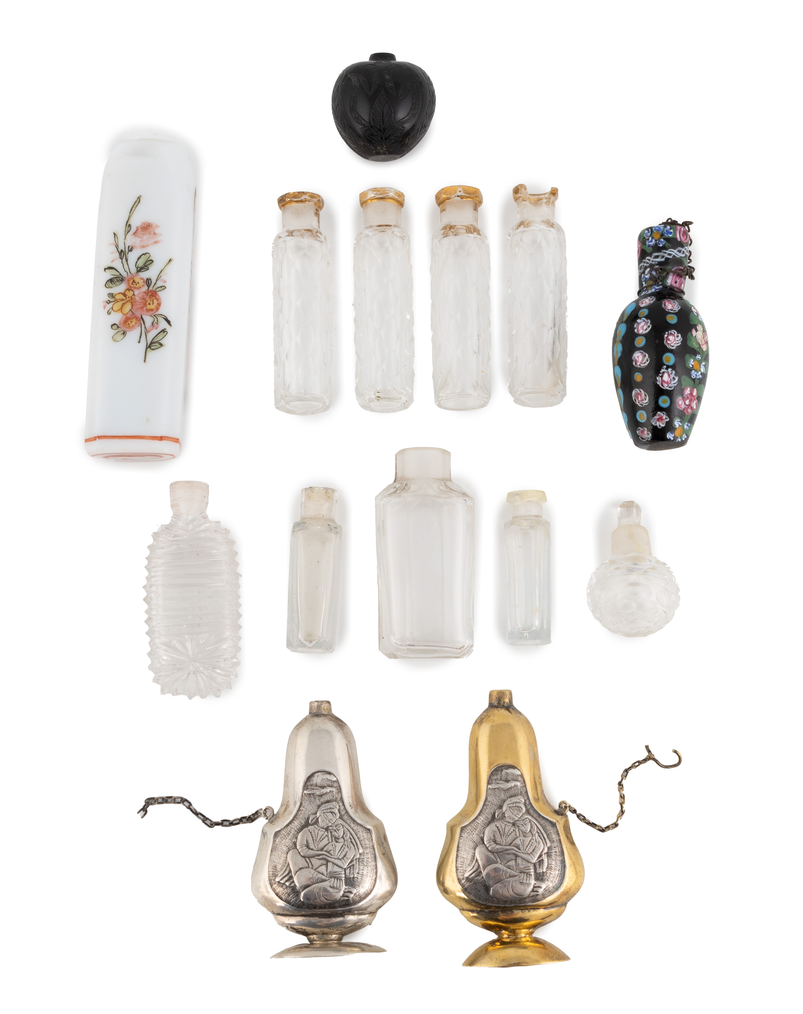 shaped baluster form, one gilded, both with a scene of a mother and child, with chains, no stoppers, heights 6.3cm and 6cm, plus a Venetian one with flowers on a black ground, a glass one with a monogram, a set of four glass one, (one a/f), five further ones and a carved nut. (14)