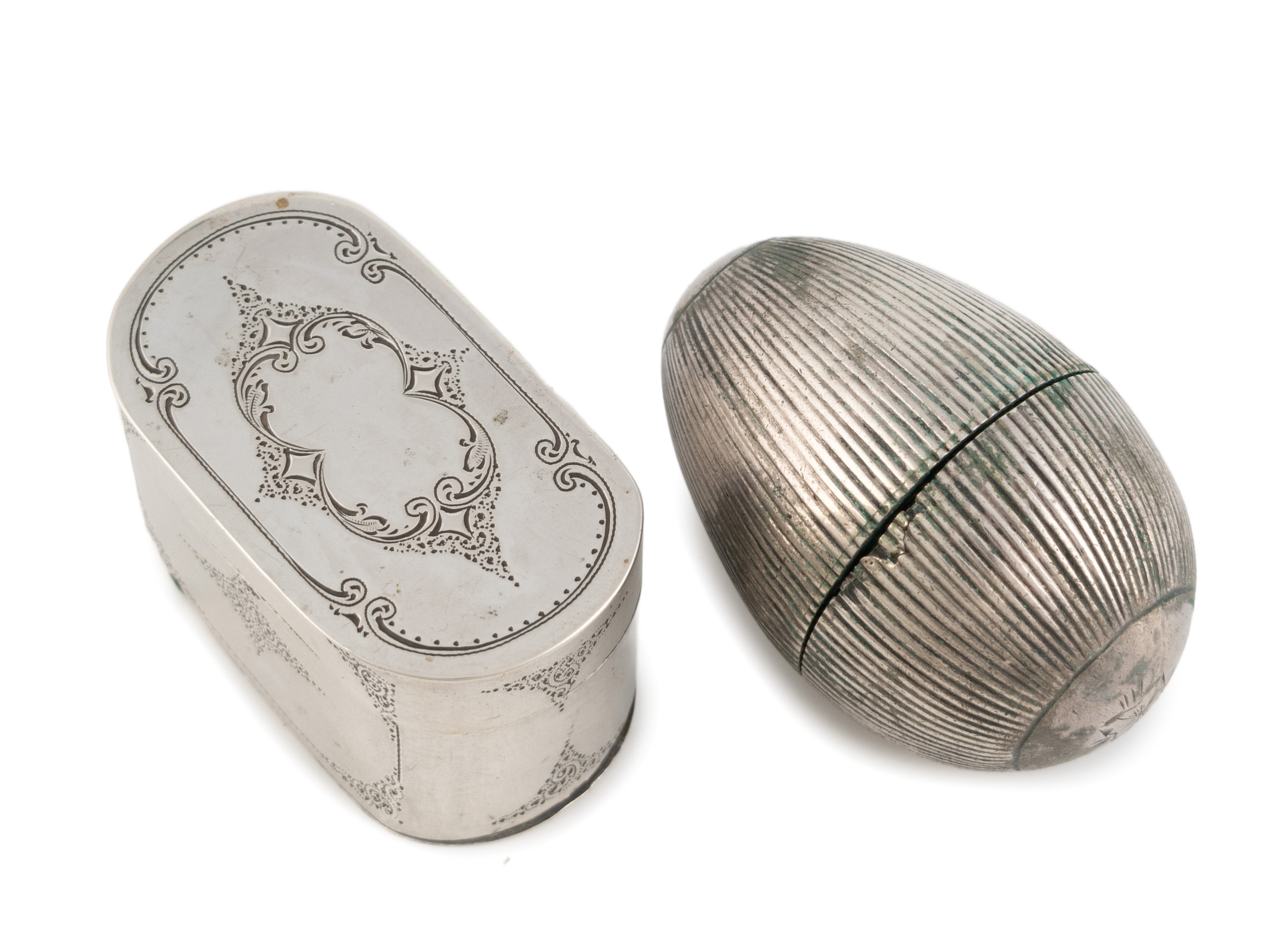 egg form with fluted decoration, an engraved flower to the underside of the base, gilded interior and a pull-out steel grater, length 5.4cm, the other maker's mark worn, rounded rectangular form with engraved scroll decoration, hinged cover and base with a steel grater to the interior, length 5.1cm, approx. total weight 2.2oz. (2)