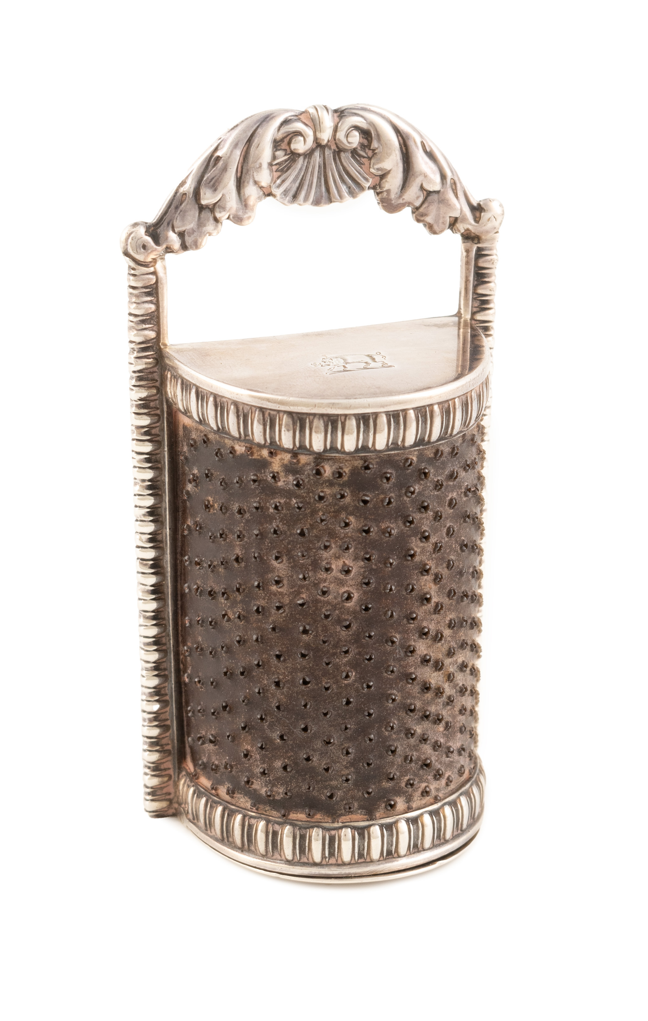 arched rectangular form, gadroon and foliate shell handle, engraved with a crest, with a curved steel grater and a hinged base, height 9.6cm.