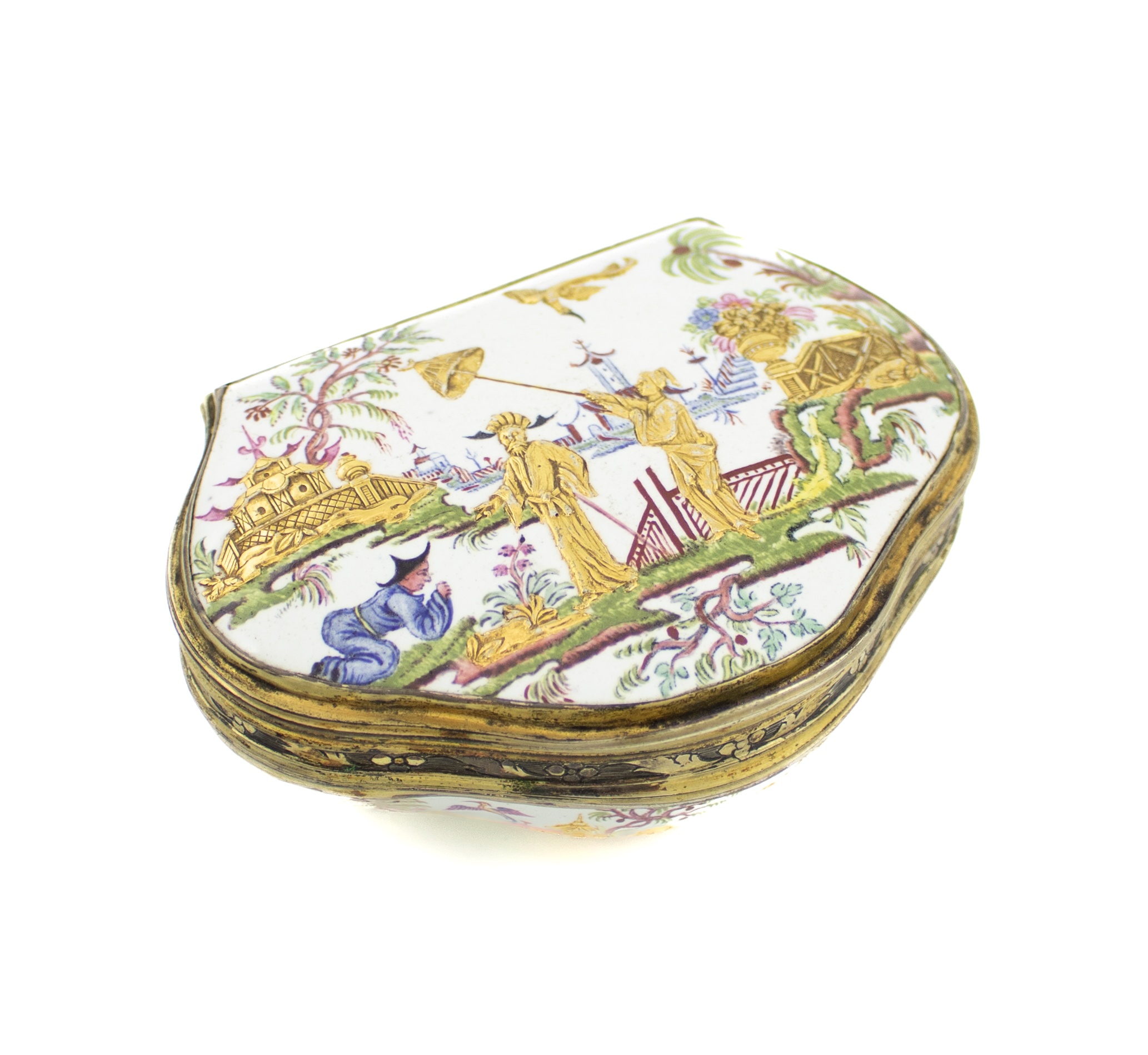 cartouche form, decorated with gilded Chinese figures in landscape settings with pagodas, the base with a spray of flowers, the interior decorated with flowers, and with a seated Chinese figure, in a later case, length 8.2cm.