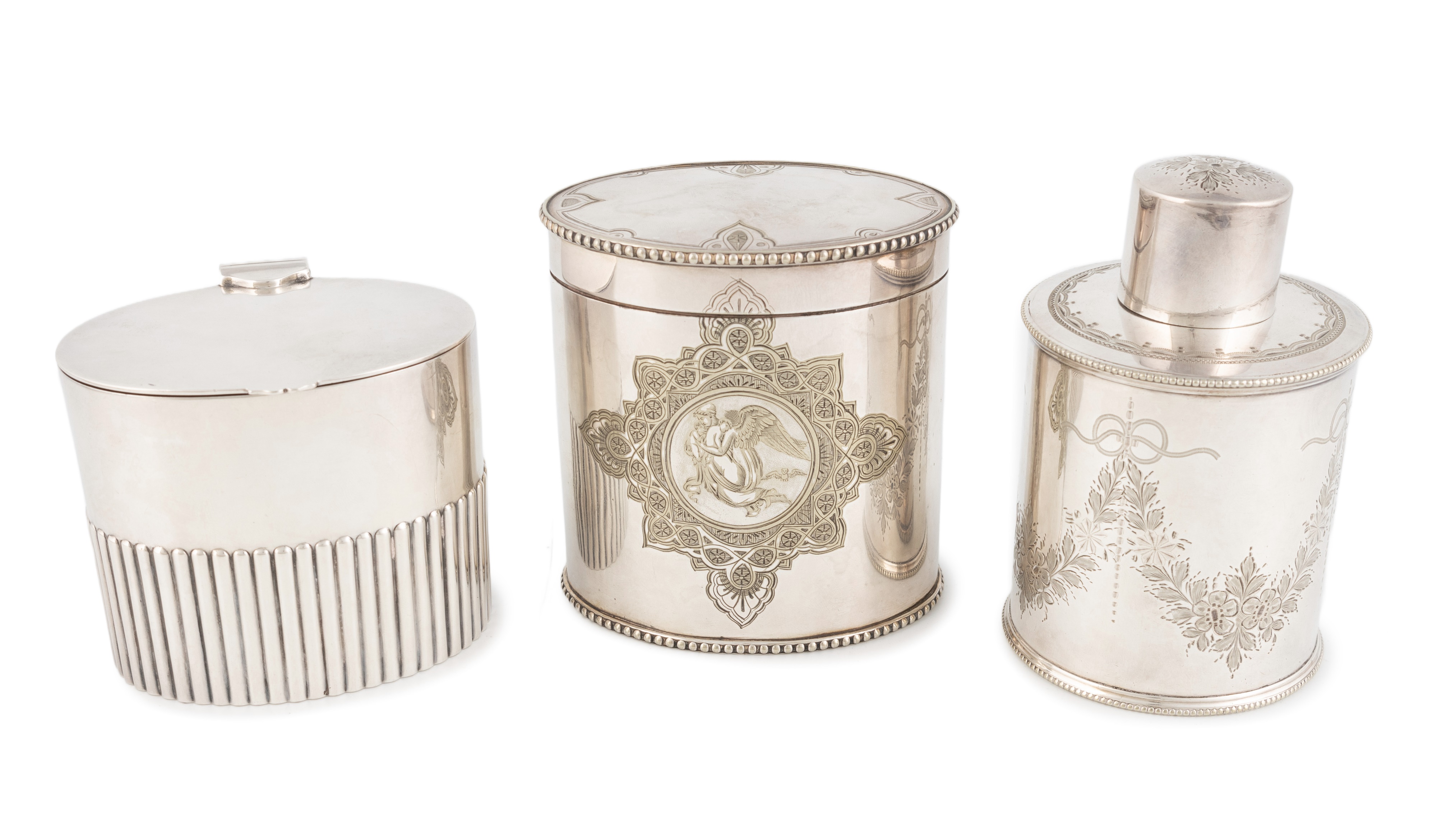 oval form, part fluted decoration, flush hinged cover, width 9.7cm, a Victorian one, by William Hutton & Sons, Sheffield circa 1870, circular form, beaded borders, engraved floral swag decoration, cylindrical pull-off cover with engraved floral decoration, height 12.4cm, and one by Roberts & Briggs, circa 1860, oval form, beaded borders, hinged cover, engraved with an angel and two cherubs inside a decorative cartouche, height 10.6cm. (3)
