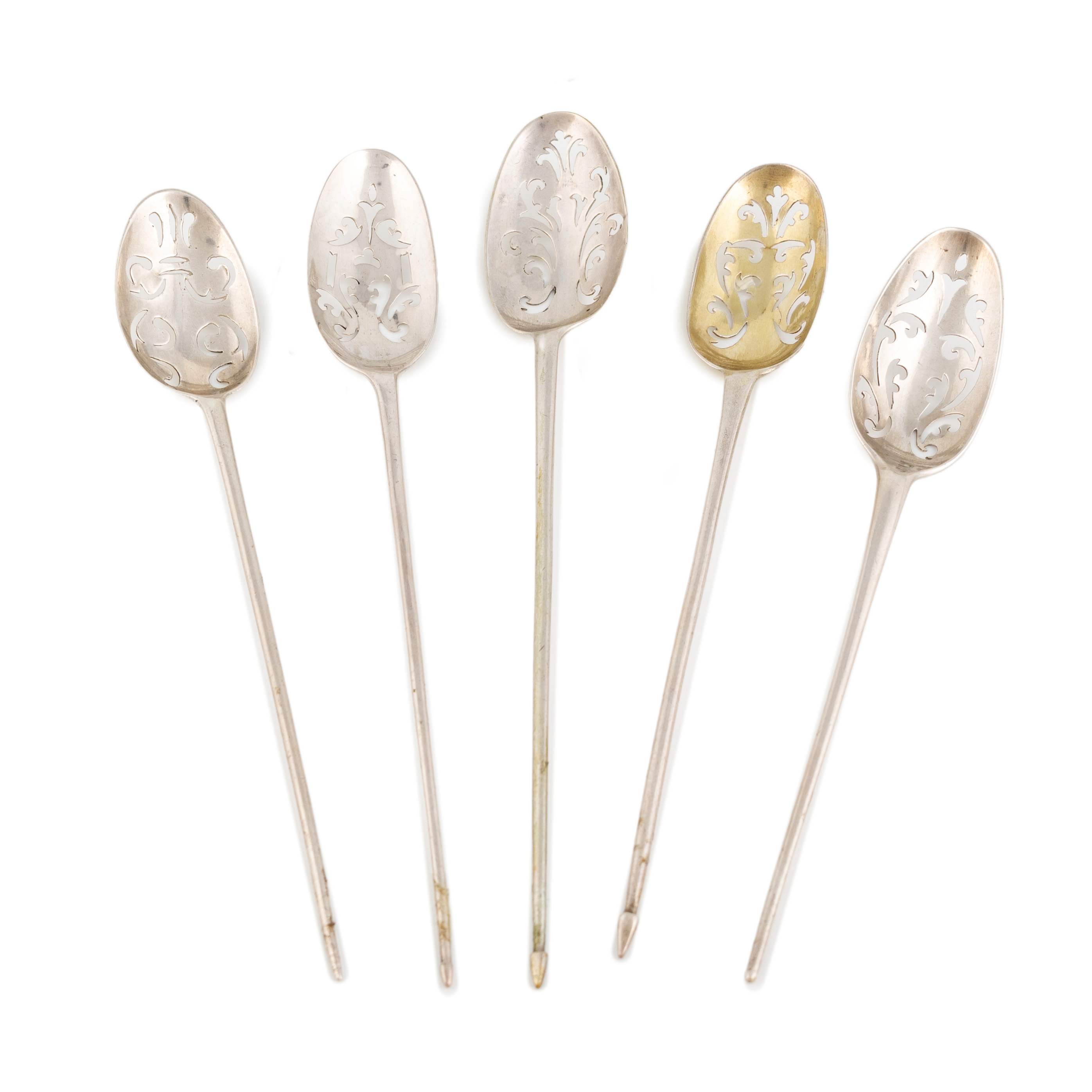 including one by John Carpender, London circa 1740, the bowl with pierced scroll decoration, plus four others with traces of makers' marks and pierced scroll bowls, one gilded, approx. total weight 1.2oz. (5)