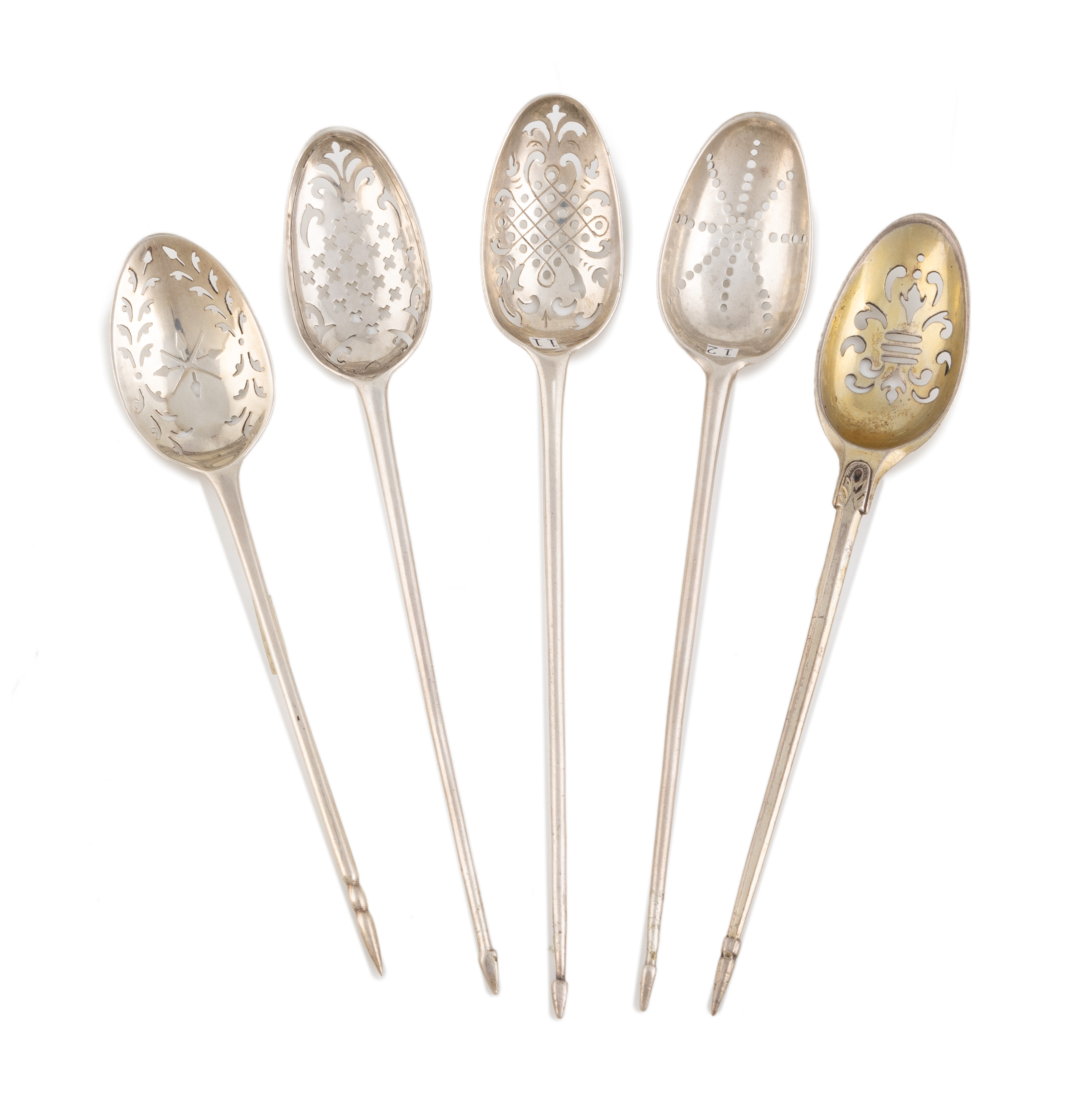 including one possibly by John Lampfet, circa 1750, the bowl pierced with scroll and mullets and with a shell heel, one pierced with a star motif, one with engraved and scroll decoration, a silver-gilt one, with chased decration, and another, approx. total weight 1.6oz. (5),