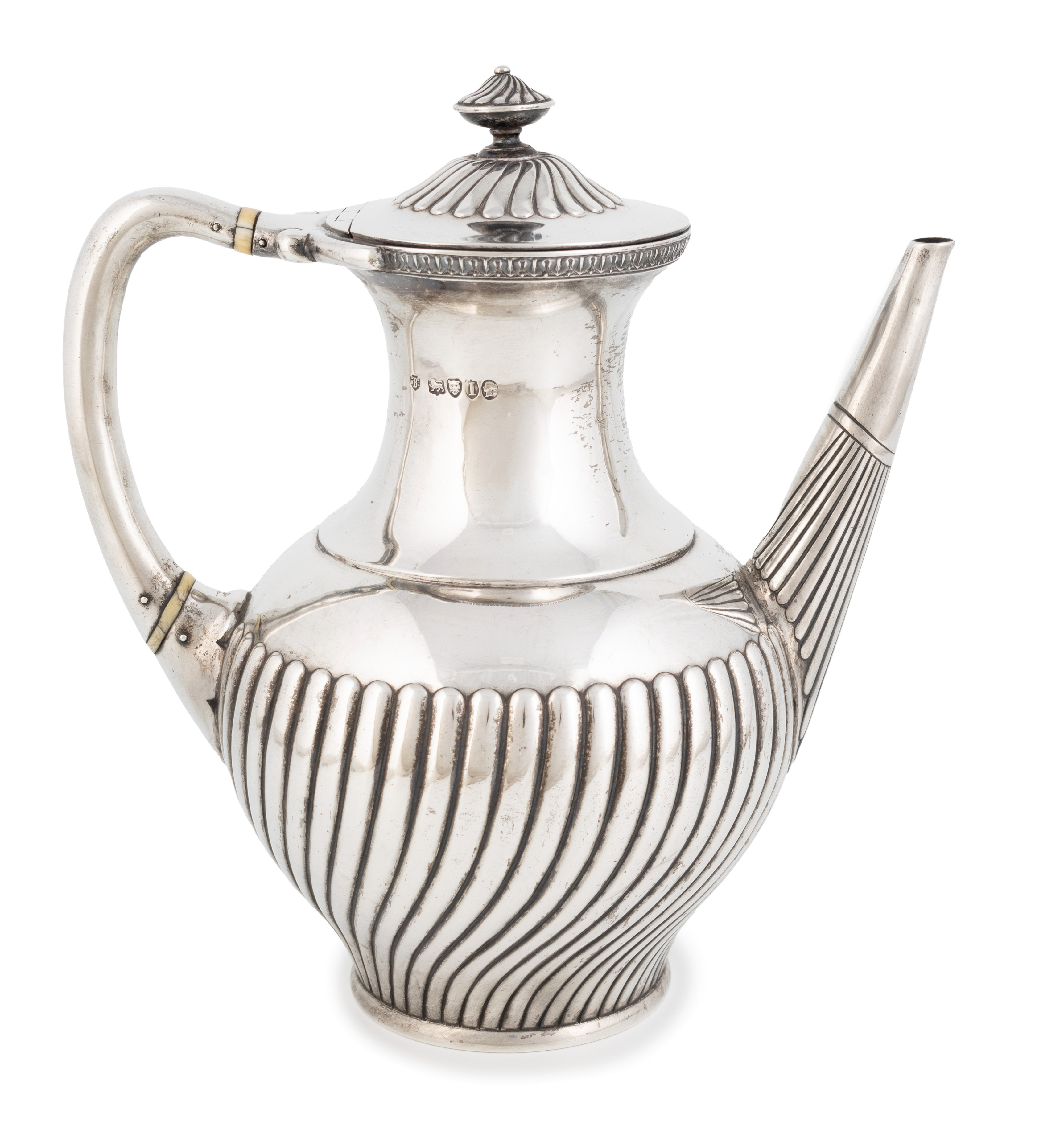 baluster form, swirl-fluted decoration, scroll handle with ivory insulators, height 22.5cm, approx. weight 24oz.