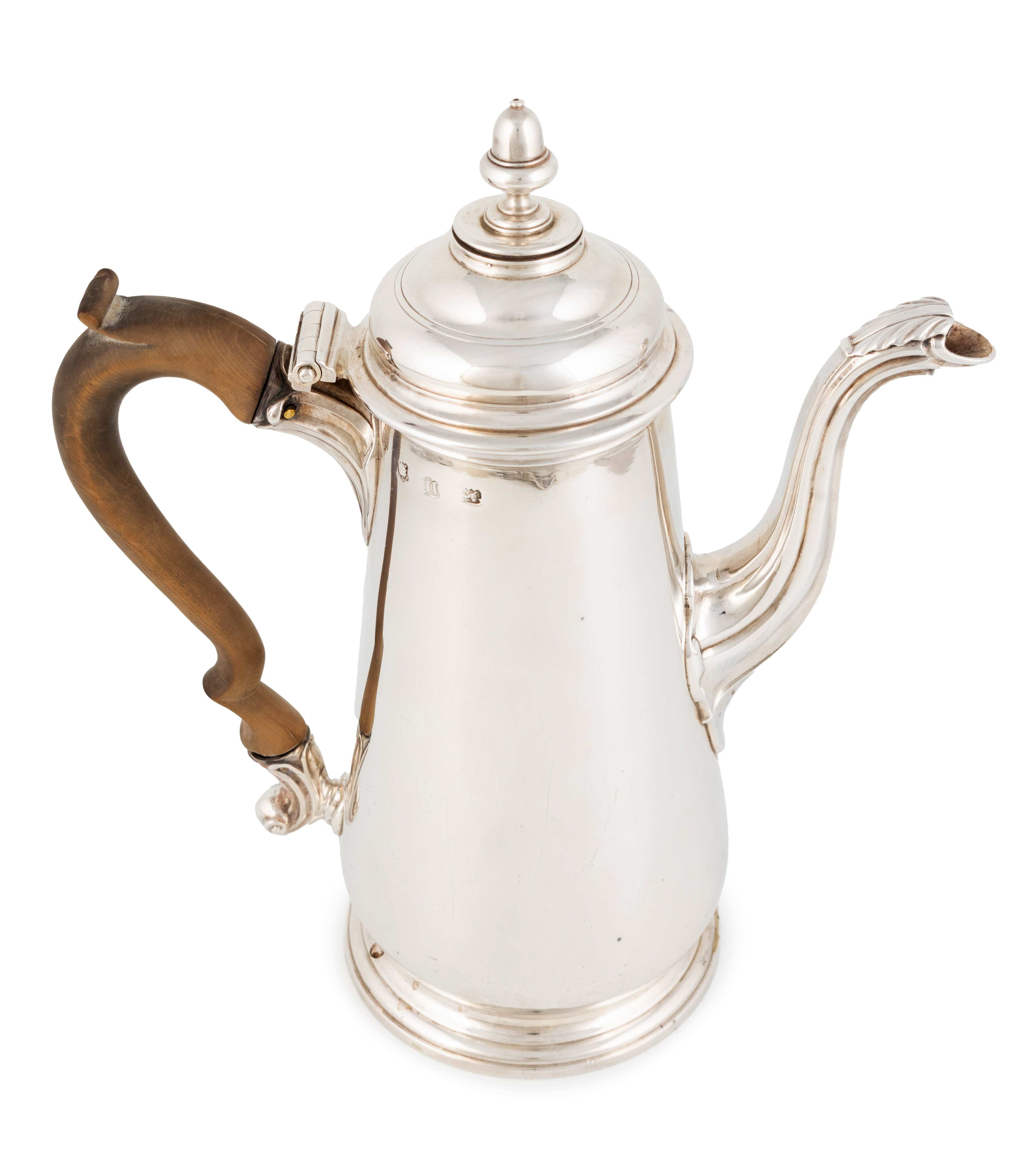 tapering circular form, scroll wooden handle, domed over with a pull-off acorn finial, height 25.8cm, approx. weight 30oz.