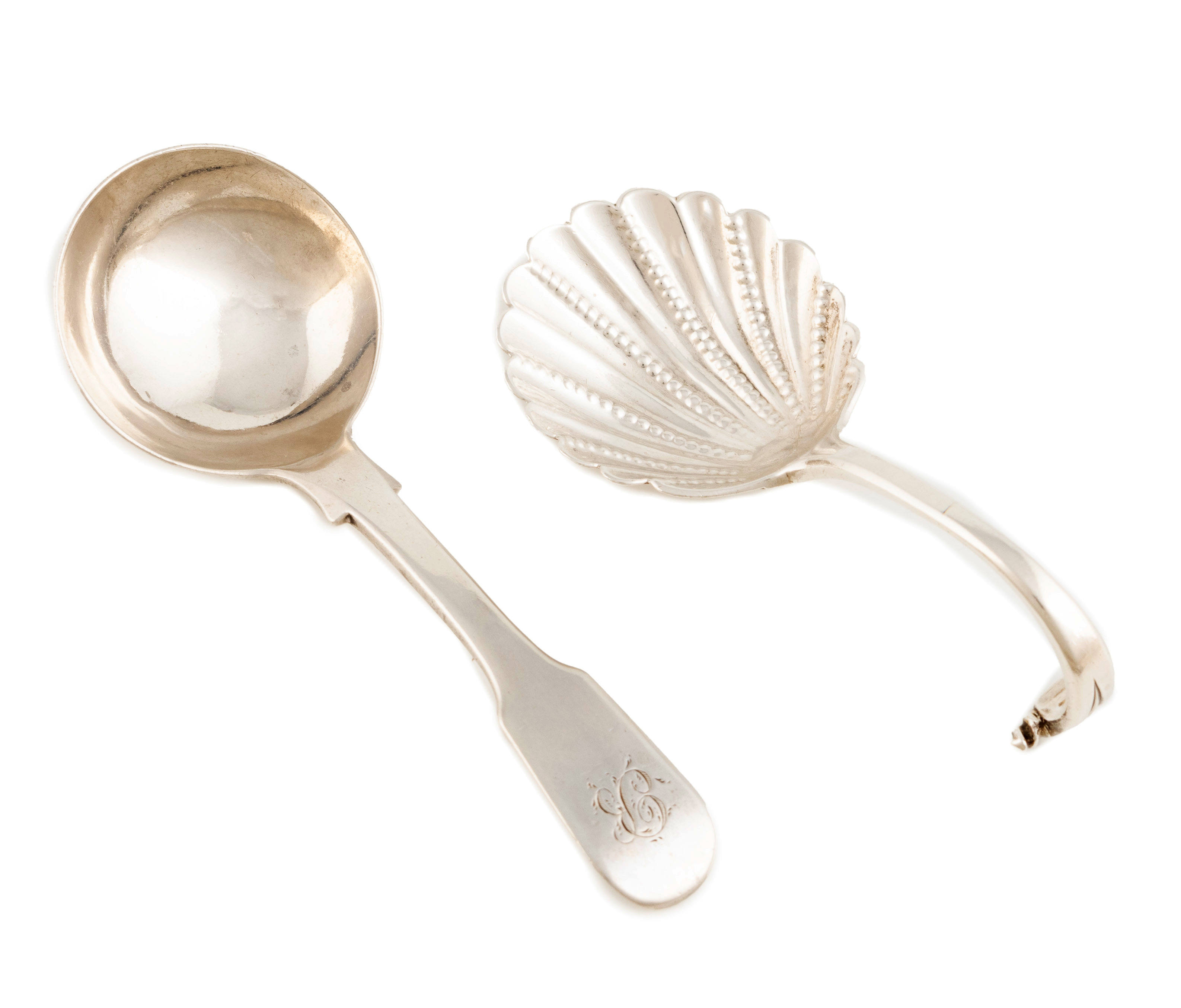 shell bowl, Onslow pattern handle, plus a George IV provincial silver Fiddle pattern caddy spoon, by Cattle and North, York 1828, approx. weight 1.6oz. (2)