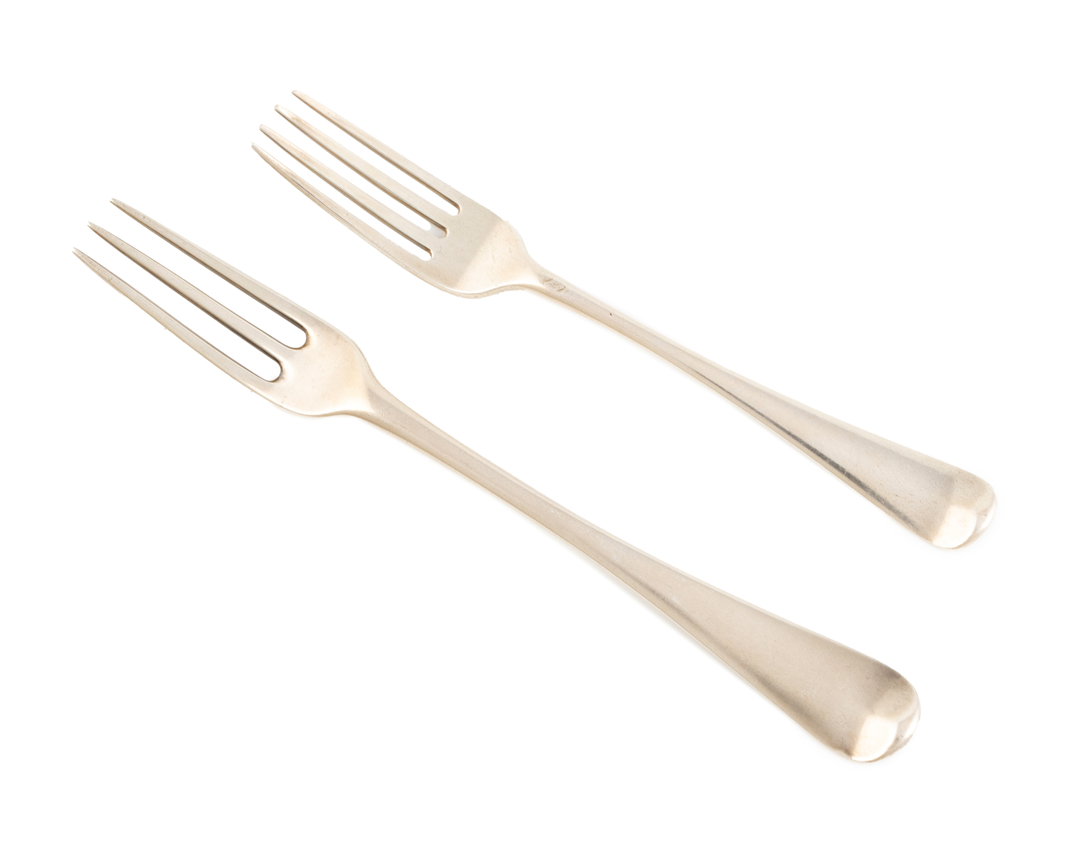 three-pronged tines, the reverse of the terminal with a crest, plus a George III provincial silver Hanoverian dessert fork, by the same maker, York 1796, also marked with a double duty mark, and a French import mark, the reverse of the terminal crested, approx. total weight 3oz. (2)