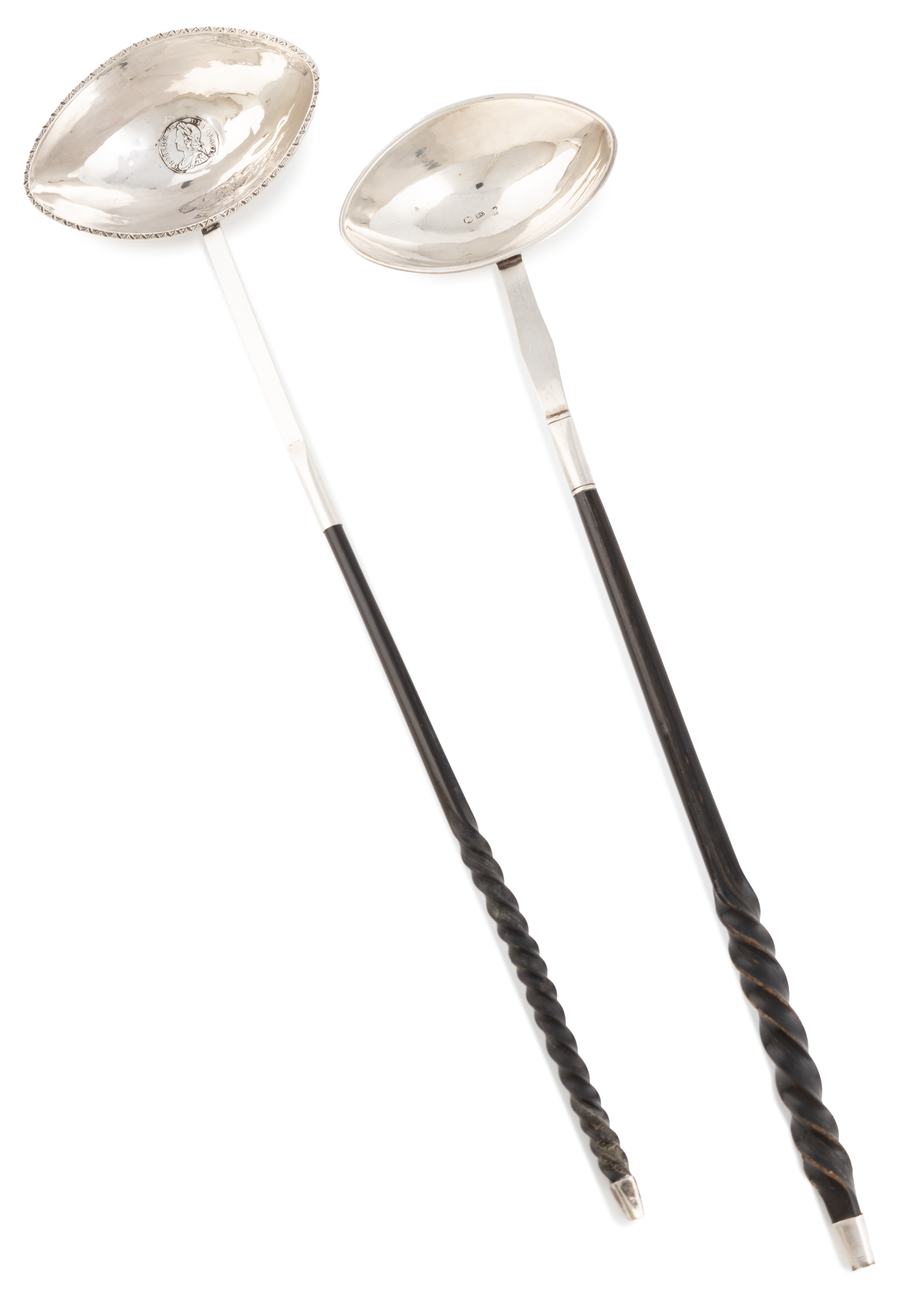 oval bowls, one set with a coin and with a bright-cut border, twisted whale-bone handles, lengths 35cm and 33.2cm. (2)