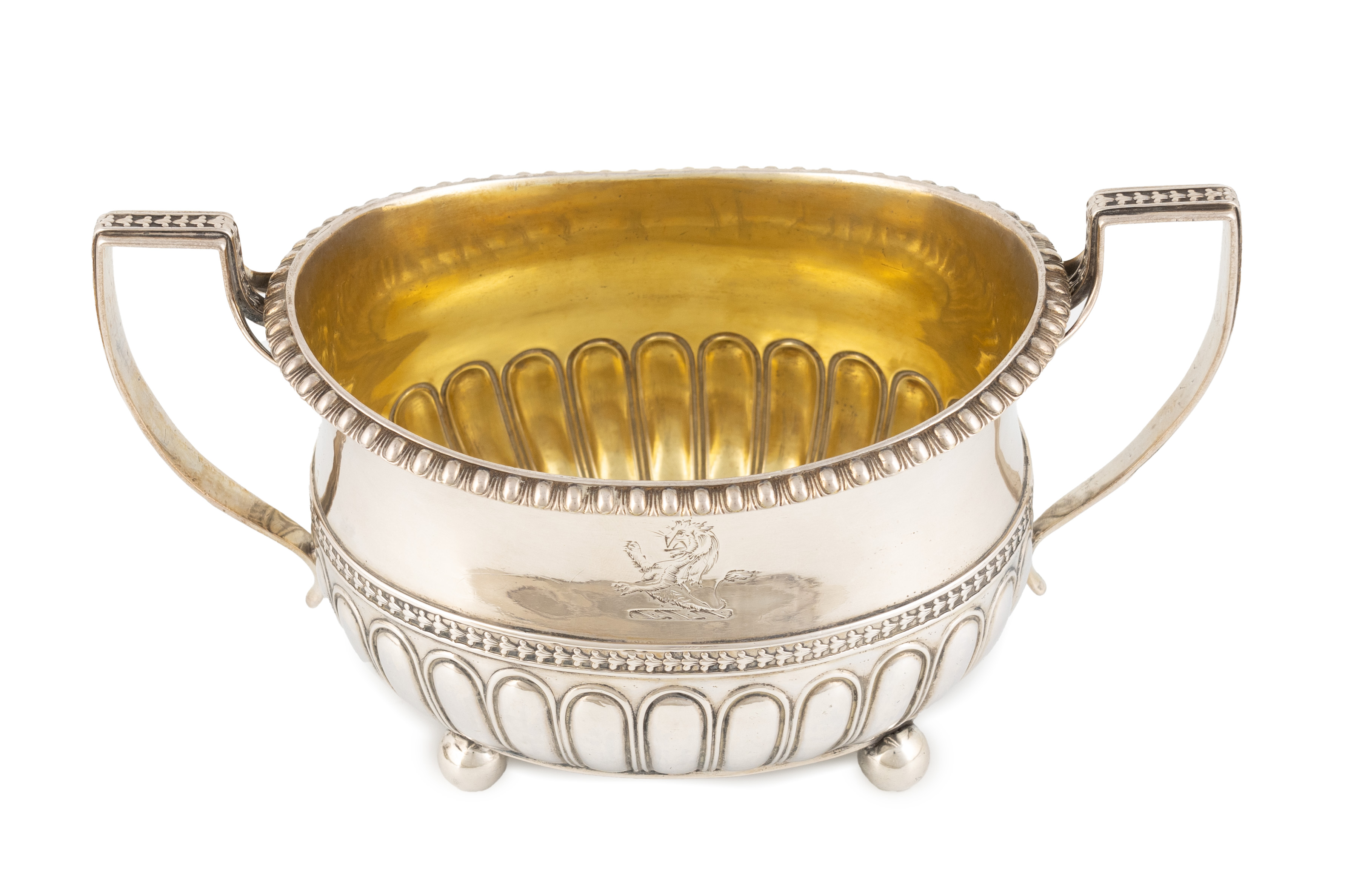 oblong form, part-fluted decoration, stylised borders, gilded bowl, on four ball feet, length handle to handle 20.6cm, approx. weight 9.8oz.