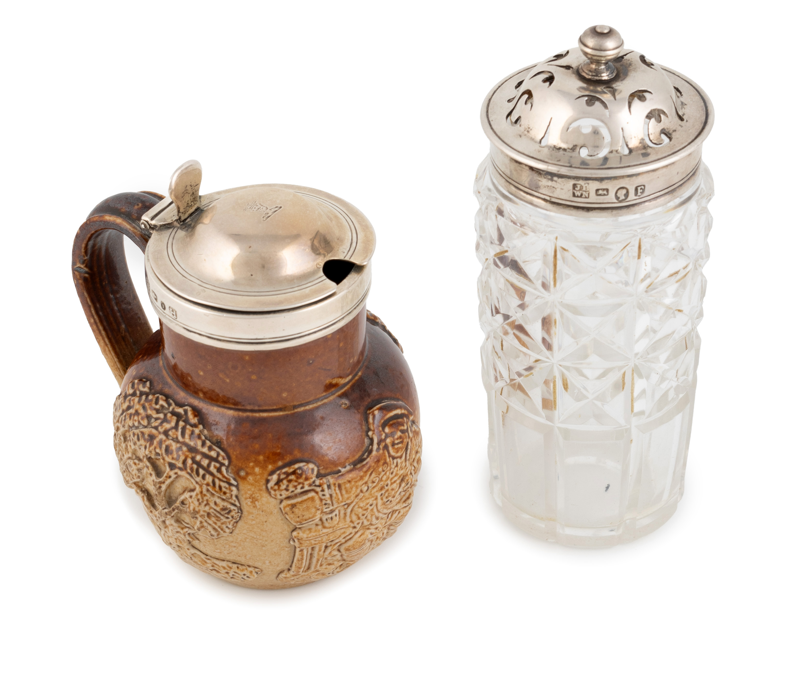 baluster form, scroll handle, domed hinged cover with a crest, height 9cm, plus a Victorian provincial silver-mounted glass condiment jar, by Barber and North, York 1841. (2)