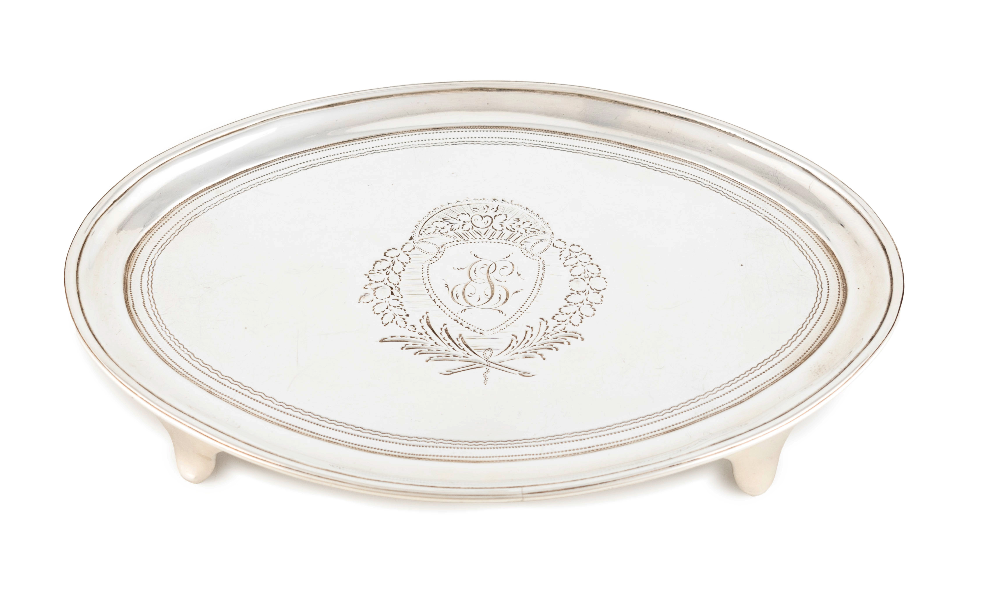 oval form, engraved borders, the centre initialled, on four bracket feet, length 17.8cm, approx. weight 4oz.