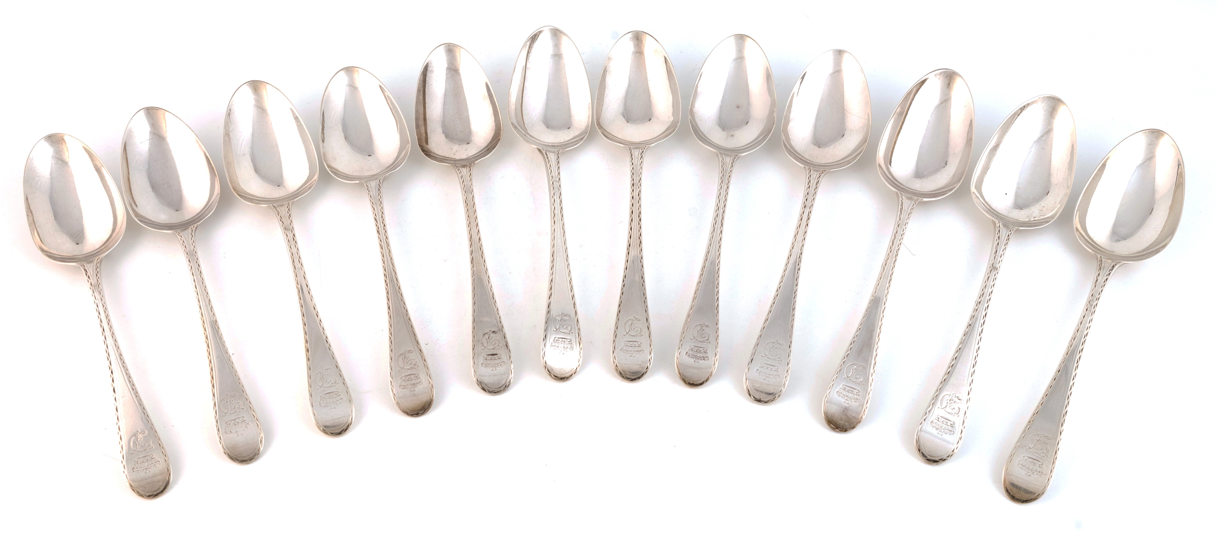A set of twelve George III silver Bright-cut pattern tablespoons,