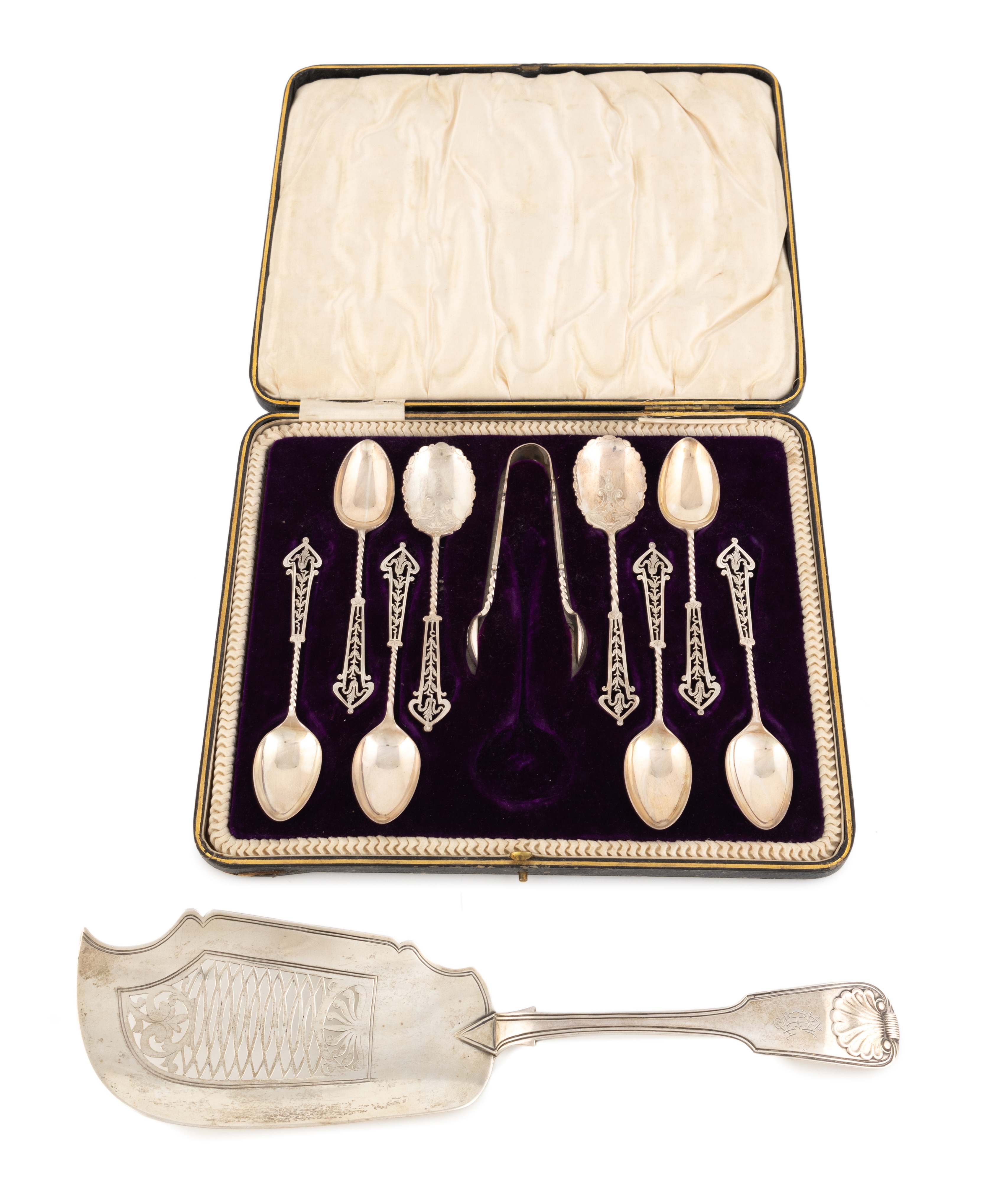 pierced blade, the terminal initialled, plus a set of six silver teaspoons, a pair of sugar tongs and two jam spoons, in an associated case, approx. total weight 9.7oz. (10)