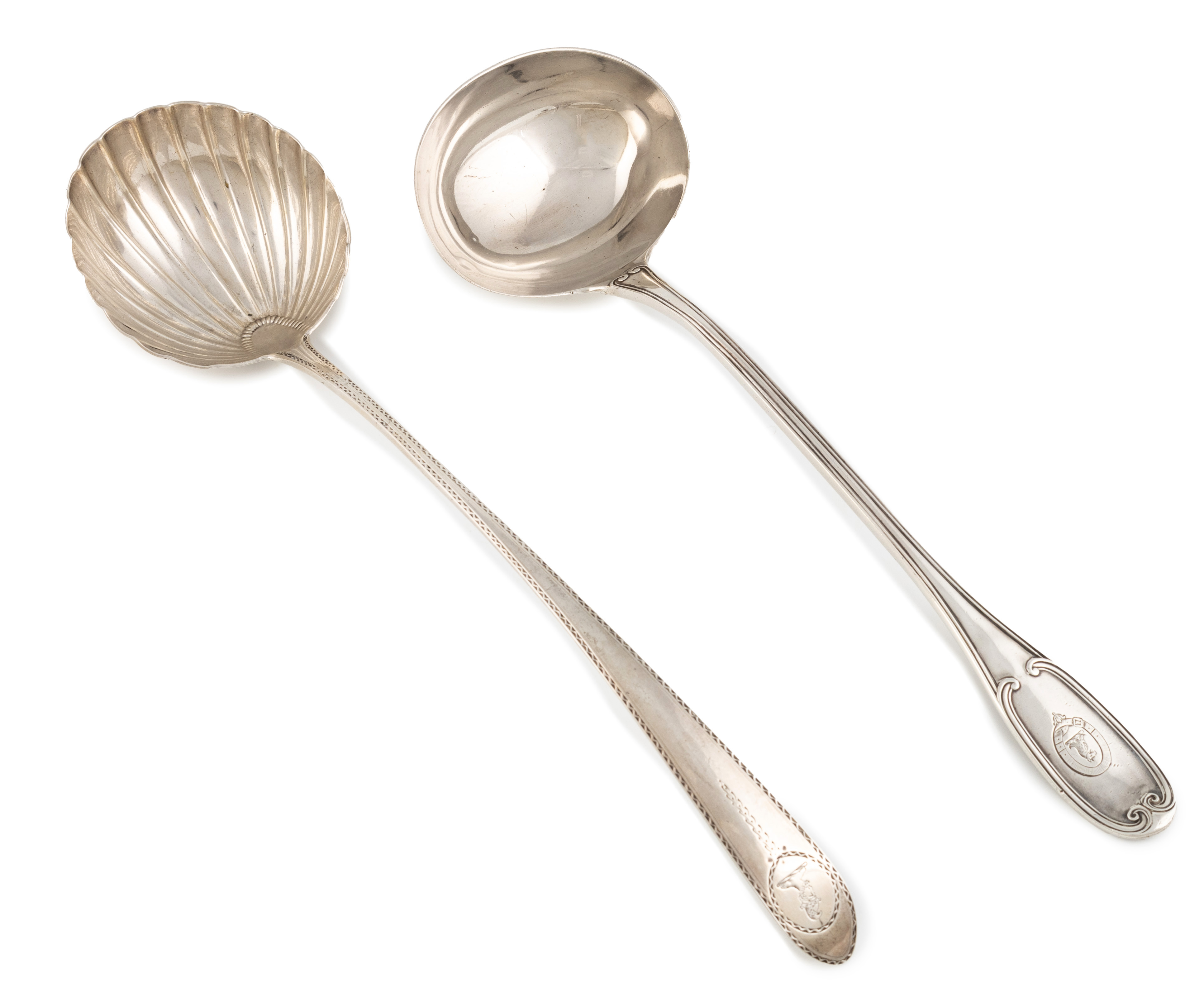 the terminal with a crest, plus a George III West Country Bright-cut soup ladle, by Roger Symons, Exeter, also with a later stamp MS, with a crest and initials approx. total weight 15oz. (2)