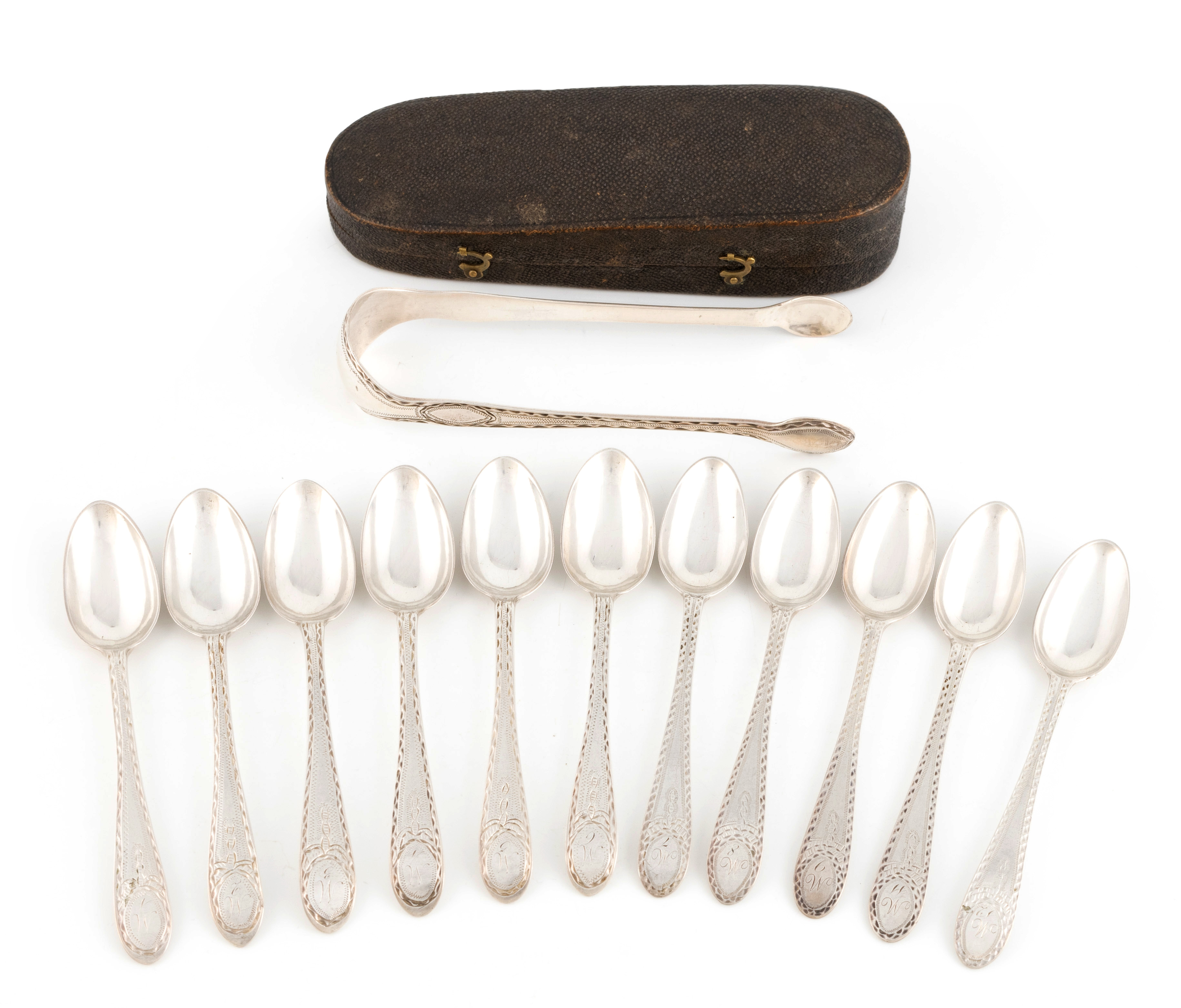 A matched set of eleven late-18th/early-19th century Bright-cut silver teaspoons and a pair of sugar tongs,