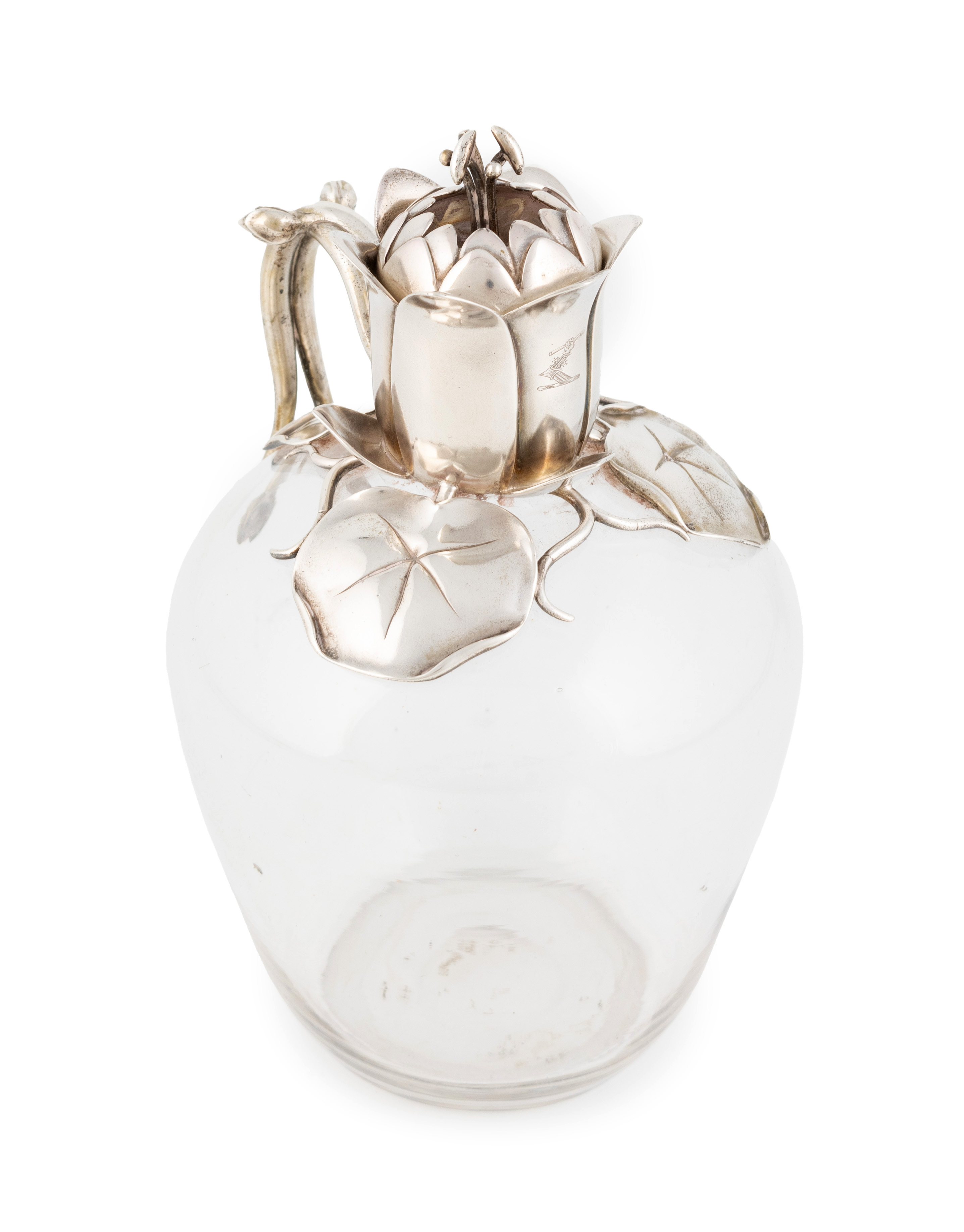 tapering circular plain glass body, the mounts with lily pads, the scroll handles with flower buds, hinged cover, engraved with a crest, height 19cm.