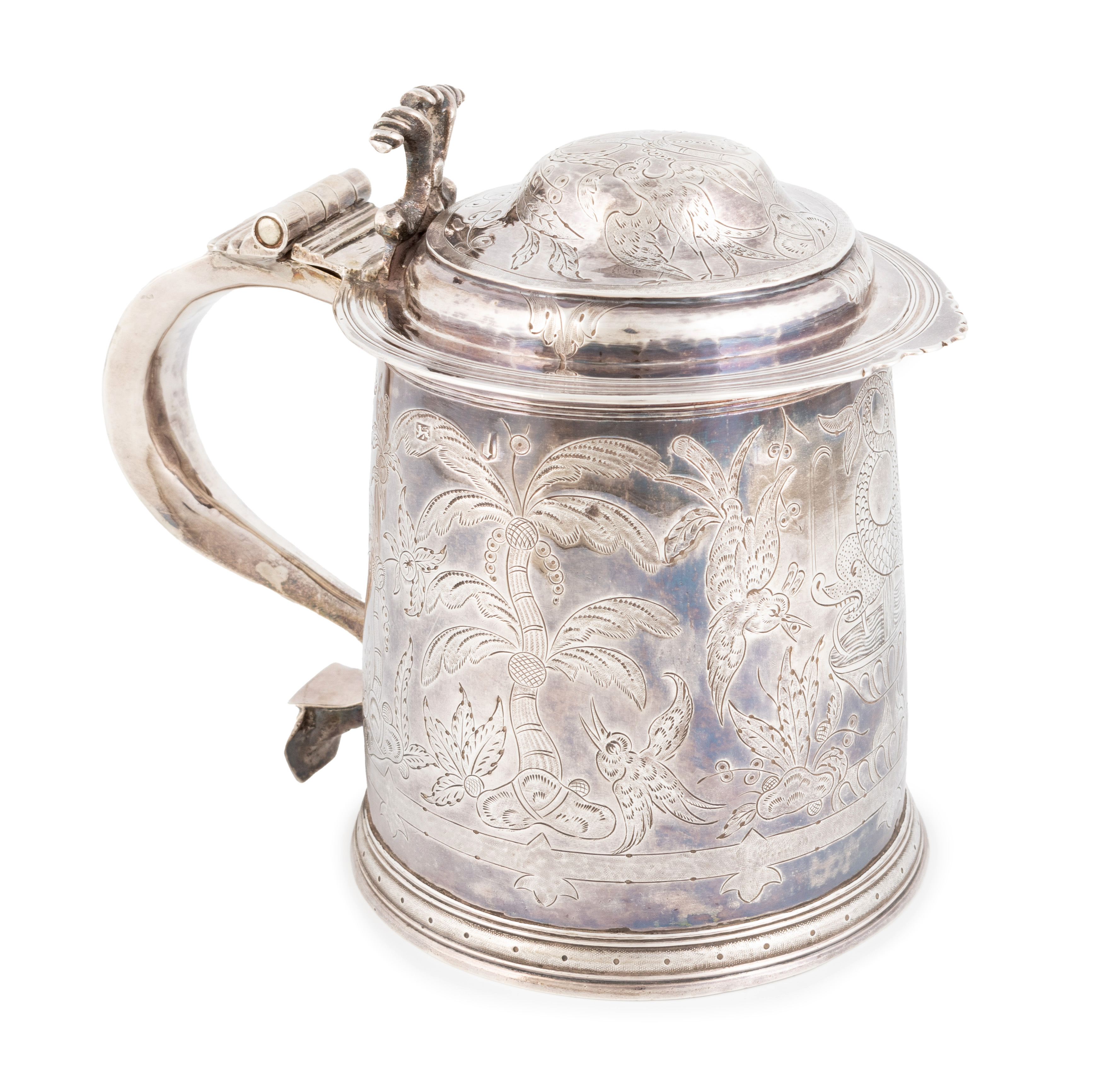 tapering circular form, scroll handle, engraved with birds and foliate decoration in the Chinoiserie manner, the front with two mythical dolphins, the slightly domed hinged cover with a scroll thumbpiece and similar decoration, height 17.5cm, approx. weight 26oz.