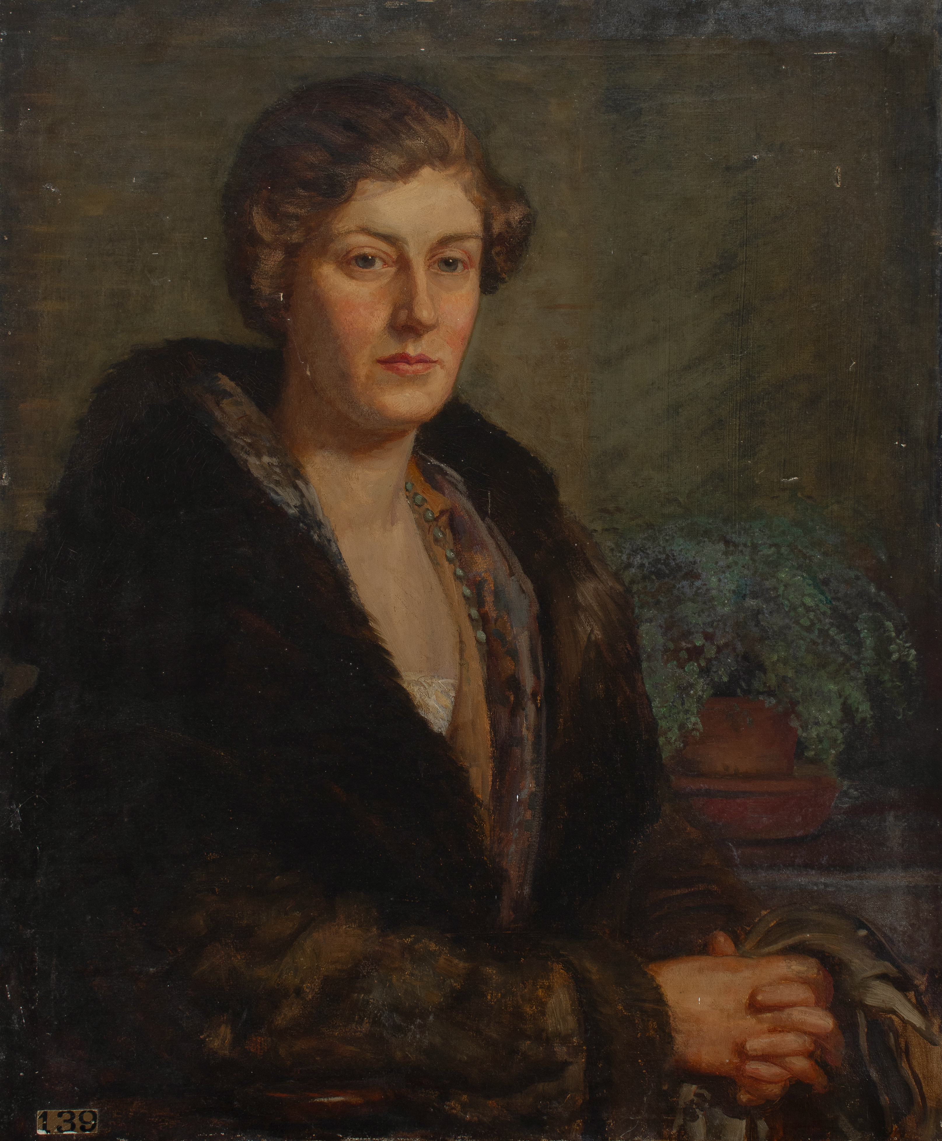 Portrait of a lady, half-length, wearing a fur-lined coat, seated in an interior